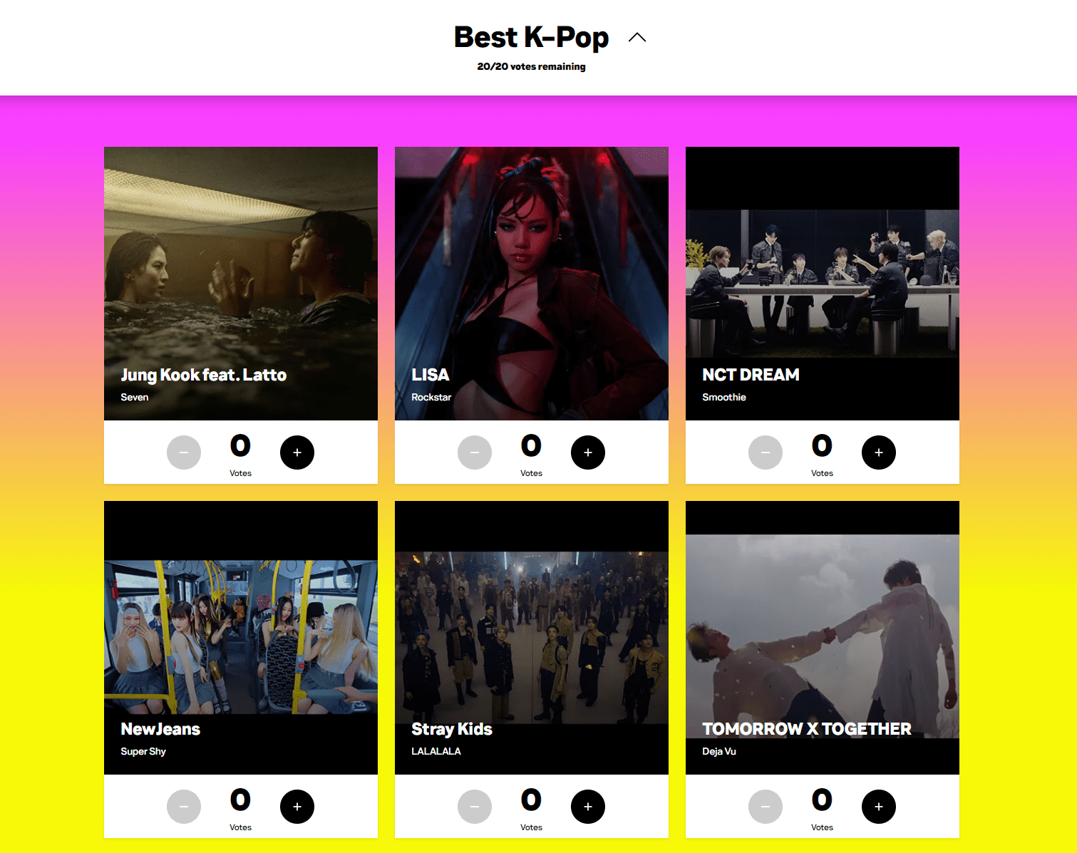 ចំណែក Jungkook សមាជិកក្រុម BTS មានឈ្មោះប្រកួតប្រជែងពានរង្វាន់ចំនួន ២ គឺពានរង្វាន់ការសហការល្អបំផុត និងពានរង្វាន់ Best K-pop ជាមួយបទចម្រៀងទោលដំបូងរបស់លោកមានចំណងជើងថា “Seven” ។ ក្រៅពី Lisa និង Jungkook សិល្បករដែលមានឈ្មោះប្រកួតប្រជែងក្នុងផ្នែក Best K-pop រួមមានក្រុមបុរស NCT Dream ក្រុមនារី NewJeans ក្រុមបុរស Stray Kids និងក្រុមបុរស Tomorrow X Together។