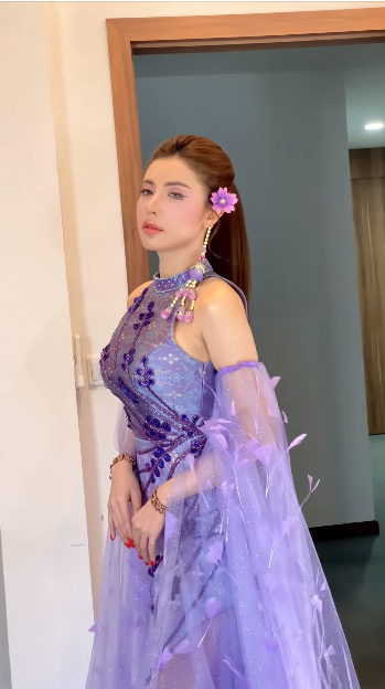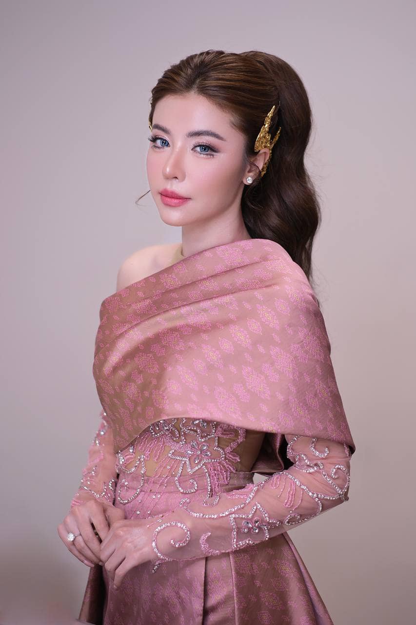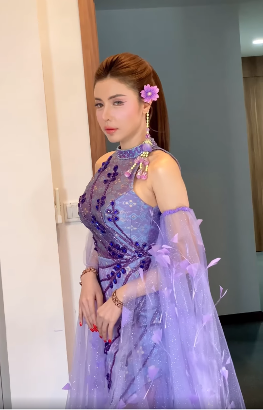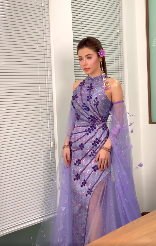 រ៉ូបពណ៌ផ្កាត្របែកព្រៃដែលច្នៃពីហូល រឹបរាង និងបន្ថែមស្បៃជាដៃអាវវែងអូសដី បង្ហាញខ្លួនយ៉ាងសមសួន។ មិនត្រឹមតែឈុតពណ៌ផ្កាត្របែកព្រៃឡើយ ពិសី ក៏ជ្រើសការផាត់មុខ និងភ្នែកពណ៌ដូចរ៉ូប ហើយសៀតផ្កាត្របែកព្រៃនៅត្រចៀកម្ខាងទៀត មើលទៅពិតជាស្រស់ស្អាត រម្យទម និងស័ក្ដិសមនឹងកម្មវិធីថ្នាក់អន្តរជាតិ។