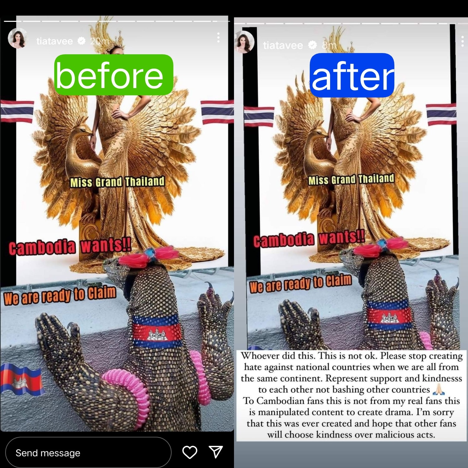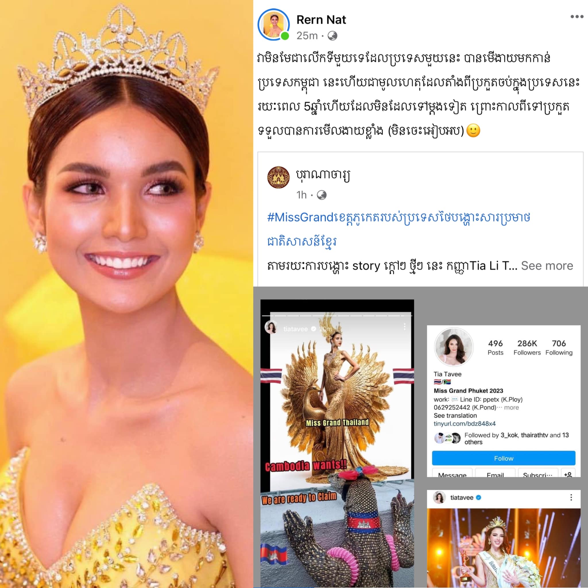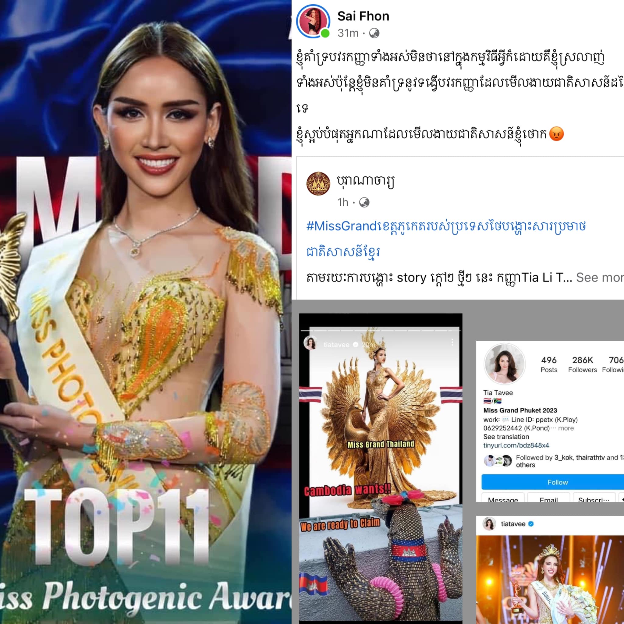 រឿងក្តៅៗបានកំពុងកើតឡើងលើវិស័យប្រកួតប្រជែងសម្រស់នៅកម្ពុជា ដោយមុននេះបន្តិចបណ្តាហ្វេនផេកអ្នកគាំទ្រវិស័យ Beauty Pageant នៅកម្ពុជា បាននាំគ្នាចេញមុខប្រតិកម្មលើ Miss Grand Phuket 2023 កញ្ញា Tia Li Taveepanichpan ដោយនាងបាន Add Story រូបភាពមួយសន្លឹកនៅលើ Instagram ។ ដំបូងនាងមិនបានដាក់ Caption នៅខាងក្រោម Story នោះទេ តែបន្ទាប់មកក៏លុបចេញវិញរួចផុសម្ដងទៀតភ្ជាប់មកជាមួយ Caption ថ្មី។