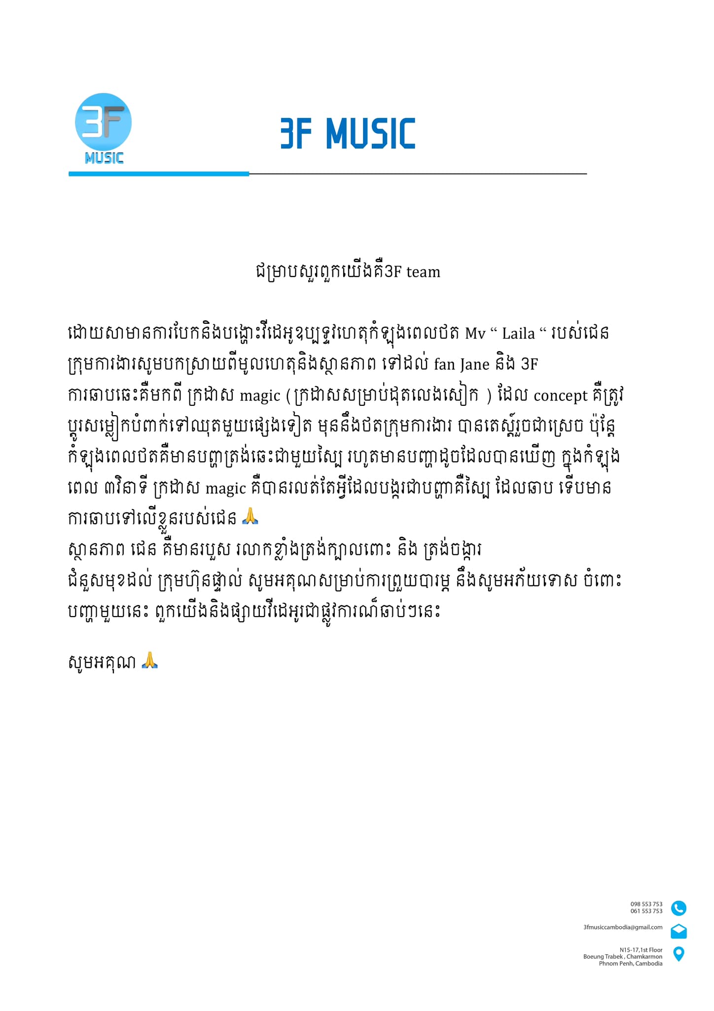 ទីបំផុត ក្រុមការងារ 3F Music បាន​ចេញមុខមកបញ្ជាក់ពីស្ថានភាព​របស់តារាចម្រៀងរូបស្រស់ ជេន (Jane Dannie) ហើយ បន្ទាប់ពីវីដេអូក្រៅឆាកនៃការថតខុសបច្ចេកទេស MV «Laila» បណ្តាលឱ្យមានការឆាបឆះ ត្រូវបានចែកចាយយ៉ាងសុះសាយពាសពេញបណ្តាញសង្គមហ្វេសប៊ុក និង Tik Tok កាលពីពេលថ្មីៗនេះ។