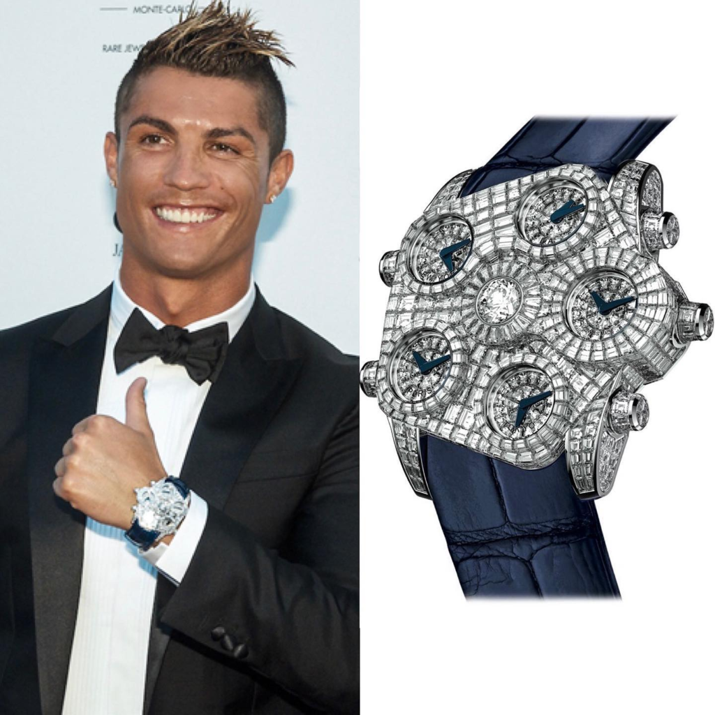 បើយោងទៅតាមការចុះផ្សាយរបស់ Superwatchman បានឲ្យដឹងថា Ronaldo បានចំណាយប្រាក់ ១លានដុល្លារគ្មានស្ដាយស្រណោះឡើយដើម្បីក្លាយជាម្ចាស់កម្មសិទ្ធិនាឡិកាដែលមានតែ ៦គ្រឿងលើលោកនេះ។ នាឡិកាមួយប្រភេទនេះមានឈ្មោះថា Jacob & Co. Grand Baguette Diamond ធ្វើពីមាសស 18k ដែលបំពាក់ដោយត្បូងពេជ្រ baguette 761 គ្រាប់នេះបើយោងតាមគេហទំព័រផ្លូវការរបស់ក្រុមហ៊ុននេះ។