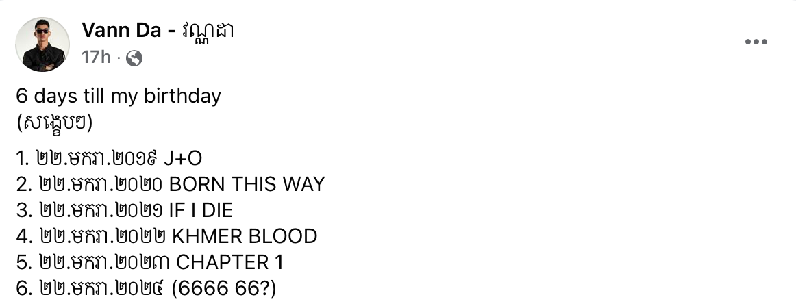 វណ្ណដា បានសង្ខេបខ្លីៗអំពីស្នាដៃបទចម្រៀងរបស់ខ្លួន ដោយមានបញ្ជាក់ថ្ងៃខែ និងឆ្នាំច្បាស់លាស់។ ក្នុងនោះ រួមមានបទ «J+O» «BORN THIS WAY» «IF I DIE» «KHMER BLOOD» «CHAPTER 1»។ ប៉ុន្តែគួរឱ្យចាប់អារម្មណ៍នៅលេខរៀងចុងក្រោយគេ ទី៦ វណ្ណដា បានដាក់ថ្ងៃកំណើតរបស់ភ្ជាប់ជាមួយ «6666 66» ធ្វើឱ្យគ្រប់គ្នាសង្ស័យថា នេះអាចជាចំណងជើងបទចម្រៀងថ្មី ដែលលោកត្រៀមបញ្ចេញលើទីផ្សារនៅថ្ងៃទី ២២ ខែមករា ឆ្នាំ ២០២៤ ខាងមុខ ដែលជាថ្ងៃខួបកំណើតគម្រប់ ២៧ឆ្នាំ របស់លោក។