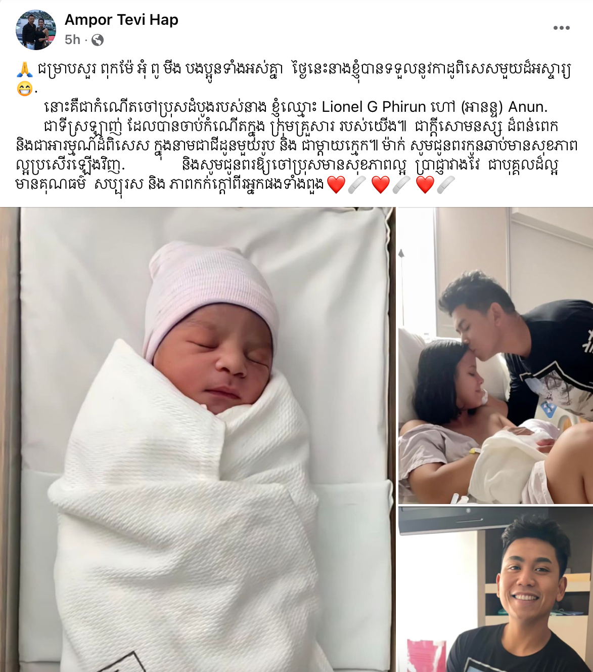 អ្នកស្រីរៀបរាប់លើគណនីផ្ទាល់ខ្លួនថា៖ «ជម្រាបសួរ ពុកម៉ែ អុំ ពូ មីង បងប្អូនទាំងអស់គ្នា ថ្ងៃនេះនាងខ្ញុំបានទទួលនូវកាដូពិសេសមួយដ៏អស្ចារ្យ នោះគឺជាកំណើតចៅប្រុសដំបូងរបស់នាង ខ្ញុំឈ្មោះ Lionel G Phirun ហៅ (អានន្ទ) Anun. ជាទីស្រឡាញ់ ដែលបានចាប់កំណើតក្នុង ក្រុមគ្រួសារ របស់យើង។ ជាក្ដីសោមនស្ស ដ៏ពន់ពេក និងជាអារម្មណ៍ដ៏ពិសេស ក្នុងនាមជាជីដូនមួយរូប និង ជាម្ដាយក្មេក។ ម៉ាក់ សូមជូនពរកូនឆាប់មានសុខភាពល្អប្រសើរឡើងវិញ និងសូមជូនពរឱ្យចៅប្រុសមានសុខភាពល្អ ប្រាជ្ញាវាងវៃ ជាបុគ្គលដ៏ល្អ មានគុណធម៌ សប្បុរស និង ភាពកក់ក្ដៅពីរអ្នកផងទាំងពួង»។