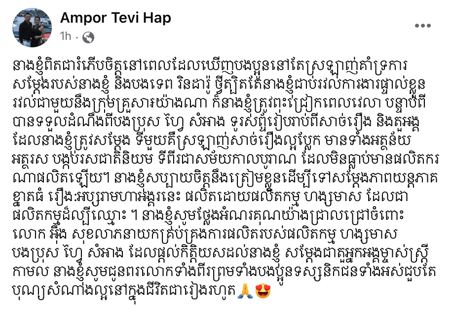 បន្ទាប់ឃើញការប្រកាសនេះ តារាសម្តែងស្រីដ៏ល្បីអំឡុងទសវត្សឆ្នាំ ៨០ និង៩០ ក៏បានបង្ហាញអារម្មណ៍រំភើបចិត្តនៅពេលដែលឃើញបងប្អូននៅតែស្រឡាញ់គាំទ្រការសម្ដែងរបស់ខ្លួន និងដៃគូលោក ទេព រិនដារ៉ូ។