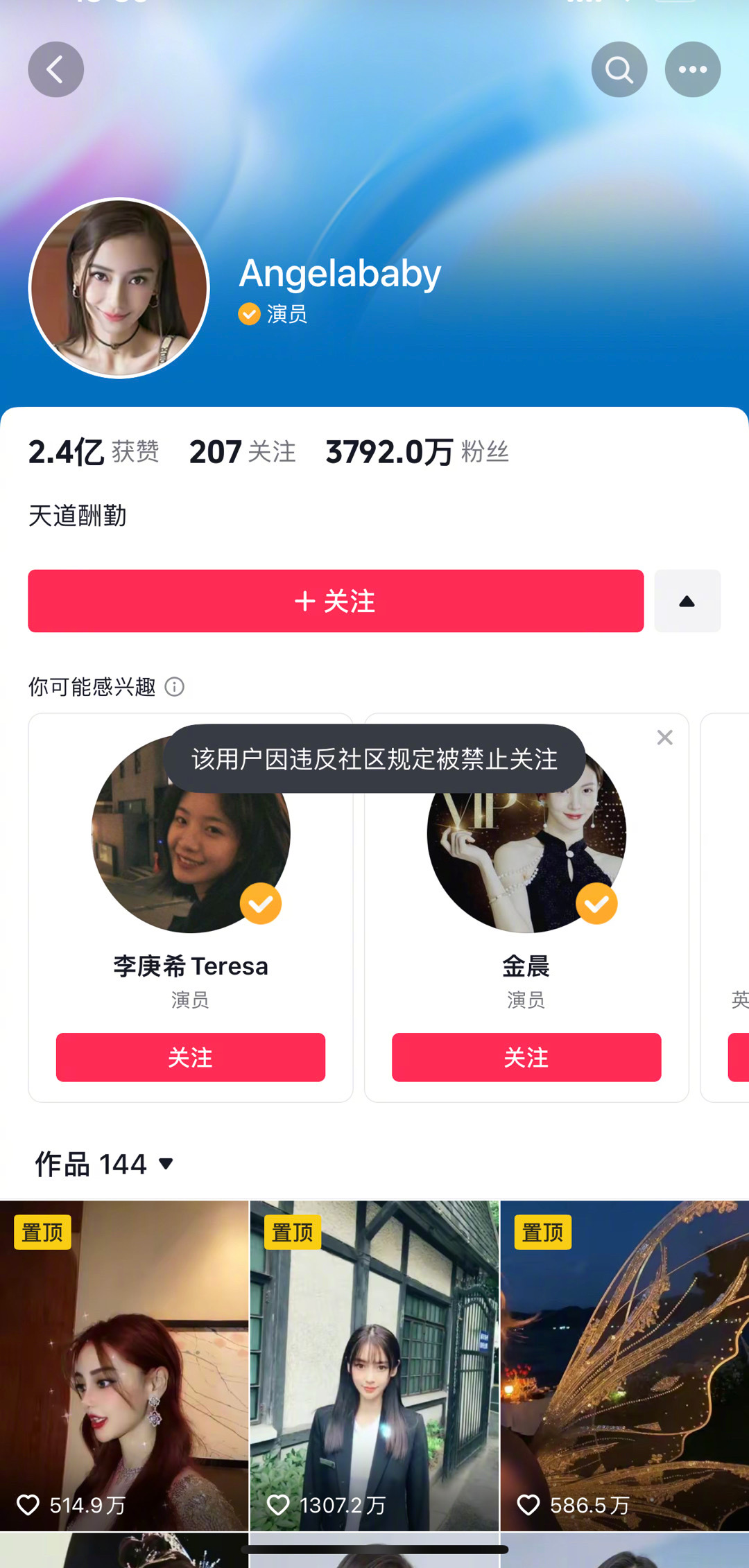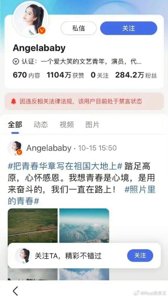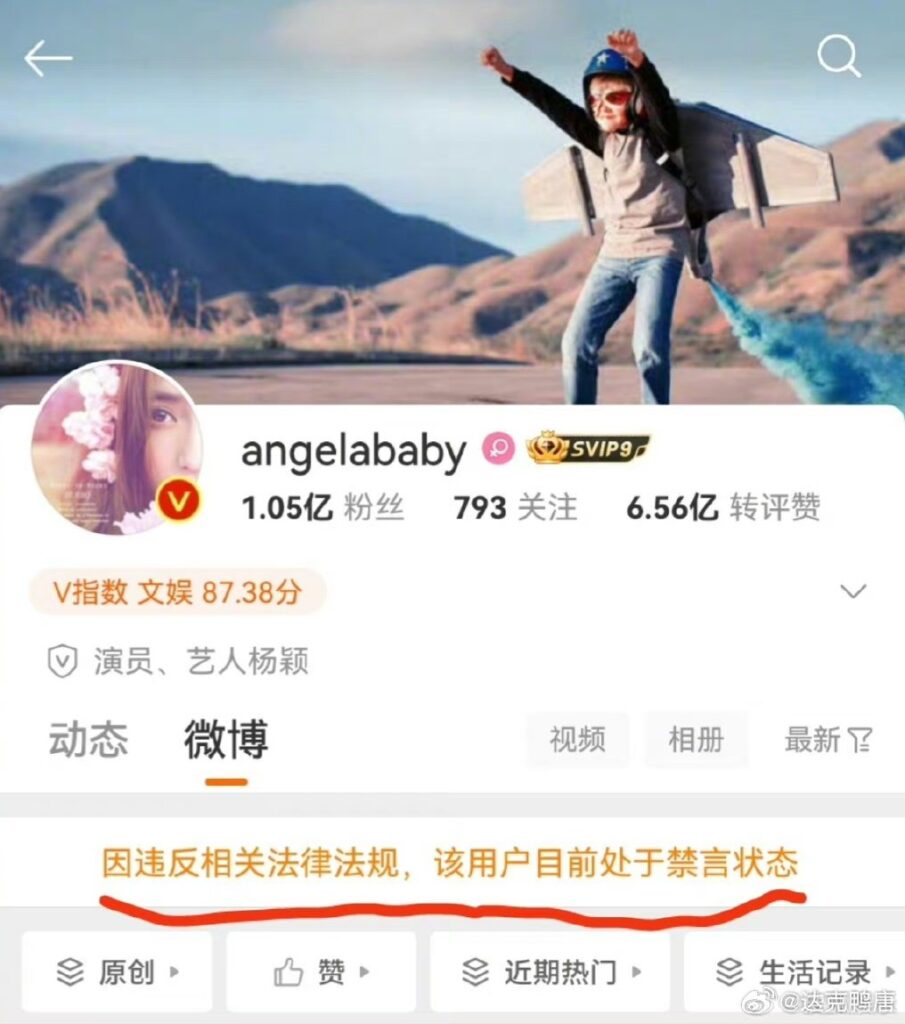 ឥឡូវនេះ គណនីផ្លូវការរបស់នាង ២ រួមមានគណី Weibo និង Douyin (Tik Tok ចិន) សុទ្ធតែត្រូវគេបិទបណ្ដោះអាសន្ន ដោយលើកឡើងថាខុសលក្ខខ័ណ្ឌ និងបំពានច្បាប់។ សូម្បីតែ Baidu Platform (ស្រដៀង Google តែសម្រាប់ប្រើប្រាស់នៅប្រទេសចិន) មិនអាចចុចស្វែងរកឈ្មោះរបស់នាង និងព័ត៌មានផ្សេងៗ ក្រោមហេតុផលដូចគ្នាថាខុសលក្ខខ័ណ្ឌ និងបំពានច្បាប់។ ក្រៅពីតារាស្រី Angelababy តារាស្រី Zhang Jiani ក៏កំពុងជួបបញ្ហាដូចគ្នា ដោយអ្នកទាំងពីរសុទ្ធតែត្រូវបានគេលើកឡើងថាបានចូលរួមទស្សនាការសម្ដែងរបស់ Lisa នៅឯ Crazy Horse។