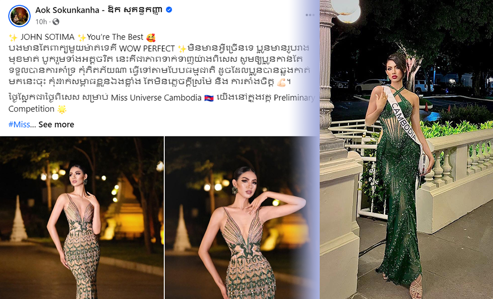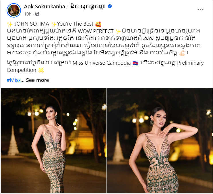 អមជាមួយរូបភាព ២ សន្លឹកម្ចាស់បទ «ស្រលាញ់គឺលះបង់» បានរៀបរាប់ពីគុណសម្បត្តិ និងបរិយាយពី ចន សុទីម៉ា យ៉ាងល្អល្អះថា “JOHN SOTIMA You’re The Bestបងមានតែពាក្យមួយម៉ាត់ទេគឺ WOW PERFECT មិនមានអ្វីច្រើនទេ ប្អូនមានរូបរាង មុខមាត់ បូករួមទាំងអត្តចរិត នេះគឺជាភាពទាក់ទាញយ៉ាងពិសេស សូមឲ្យប្អូនកាន់តែទទួលបានការគាំទ្រ កុំភិតភ័យណា ធ្វើទៅតាមបែបធម្មជាតិ ដូចដែលប្អូនបានឆ្លងកាត់មកនេះចុះ កុំដាក់សម្ពាធខ្លួនឯងខ្លាំង តែមិនភ្លេចក្ដីស្រមៃ និងការតាំងចិត្ត។ ថ្ងៃស្អែកជាថ្ងៃពិសេស សម្រាប់ Miss Universe Cambodia 🇰🇭 យើងនៅក្នុងវគ្គ Preliminary Competition”។