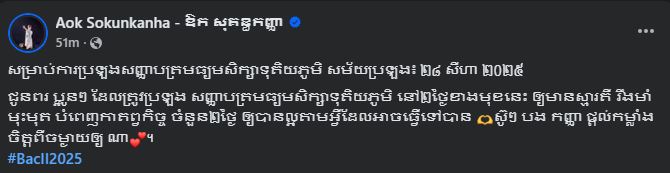 នៅសល់ ២ ថ្ងៃទៀតការប្រឡងសញ្ញាប័ត្រមធ្យមសិក្សាទុតិយភូមិនឹងមកដល់។ បណ្ដាសិស្សានុសិស្សថ្នាក់ទី ១២ ទាំងអស់ទាំងនៅក្នុងក្រុង និងតាមបណ្ដាខេត្តបានត្រៀមខ្លួនយ៉ាងរួចរាល់ ដើម្បីប្រយុទ្ធក្នុងសមរភូមិដ៏ក្ដៅគគុកមួយនេះ។ ឆ្លៀតក្នុងឱកាសនេះ សុគន្ធកញ្ញា បានសរសេរជាសំណេរលើកទឹកចិត្តនិងជូនពរពីចម្ងាយដល់សិស្សដែលត្រូវប្រឡងបាក់ឌុបក្នុងឆ្នាំសិក្សា ២០២៥ នេះឱ្យទទួលបានលទ្ធផលជាទីគាប់ចិត្តក្នុងការប្រឡង។