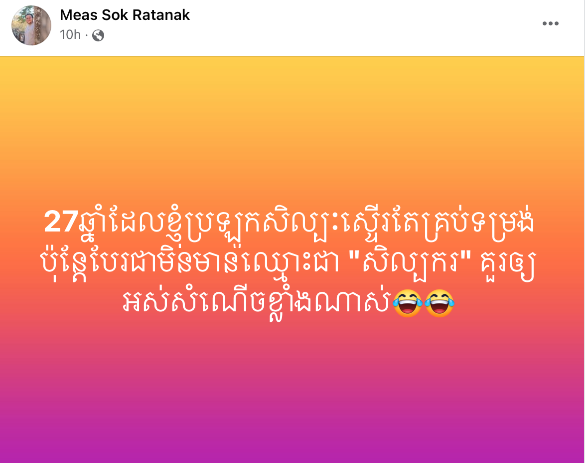 ស្របពេលដែលកម្មវិធីពិសាអាហារសាមគ្គី និងផ្តល់គ្រឿងឥស្សរិយយសជូនលោកគ្រូ អ្នកគ្រូ សិល្បករ សិល្បការិនី កំពុងត្រៀមប្រារព្ធឡើងនៅថ្ងៃ ២៥ ខែមេសា ឆ្នាំ ២០២៤ ខាងមុខ ស្រាប់តែគេប្រទះឃើញអ្នកនិពន្ធទំនុកច្រៀង និងតារាចម្រៀង មាស សុខរតនៈ បង្ហោះសារយ៉ាងខ្លី តែអត្ថន័យចាក់ដោត នៅរសៀលថ្ងៃ ២២ ខែមេសា ថា « 27ឆ្នាំដែលខ្ញុំប្រឡូកសិល្បៈស្ទើរតែគ្រប់ទម្រង់ ប៉ុន្តែបែរជាមិនមានឈ្មោះជា “សិល្បករ” គួរឲ្យអស់សំណើចខ្លាំងណាស់»។