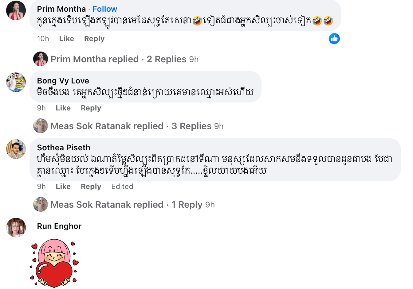 ទោះអតីតអ្នកគ្រប់គ្រងផលិតកម្ម ថោន រូបនេះ មិនទាមទារអ្វីច្រើនពីរឿងនេះ ដោយគ្រាន់តែបង្ហោះសារឡើងដោយការហួសចិត្តក៏ពិតមែន ប៉ុន្តែអ្នកសិល្បៈ និងមហាជនជាច្រើនបានចេញមុខឡាំប៉ា ហើយការពារអ្នកនិពន្ធ និងជាអ្នកដឹកនាំការសម្តែងនេះគ្រប់ៗគ្នា។ ក្នុងនោះ មតិផ្សេងៗគ្នាជាច្រើនត្រូវបានអ្នកសិល្បៈ និងអ្នកប្រើប្រាស់បណ្តាញសង្គមធ្វើការ Comment ពីក្រោមសំណេរបស់ លោក មាស សុខរតនៈ ហើយក្នុងចំណោមនោះក៏មានសិល្បករខ្លះ ជួបរឿងហេតុដូចគ្នាជាមួយអ្នកនិពន្ធរូបនេះដែរ។