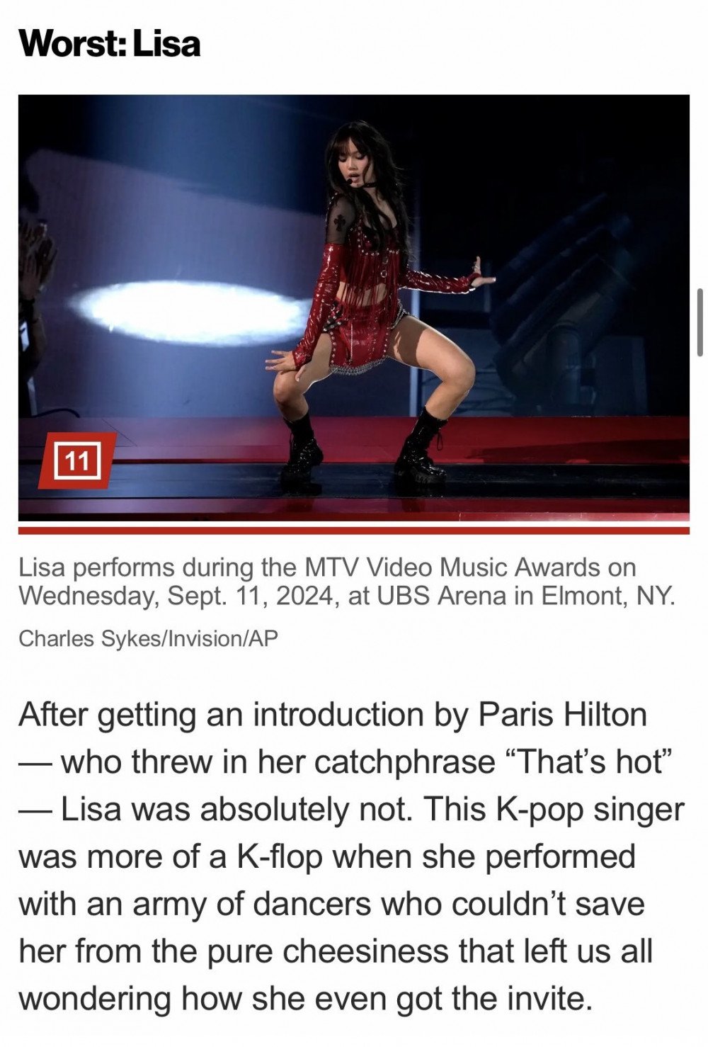 កាសែត New York Post បានរិះគន់ការសម្តែងរបស់នាងយ៉ាងចាស់ដៃ ដោយដាក់ឈ្មោះ Lisa ថា “K-flop” និងរាយឈ្មោះនាងក្នុងចំណោមអ្នកសម្តែងអន់បំផុតនាយប់នោះ ដោយសរសេររៀបរាប់ថា៖ “បើទោះជាត្រូវបានណែនាំដោយ Paris Hilton ជាមួយពាក្យថា “That’s hot” ប៉ុន្តែជាក់ស្ដែងពាក្យនេះមិនសមជាមួយ Lisa ទាល់តែសោះ។ តារាចម្រៀង K-pop រូបនេះគឺដូចជា K-flop ច្រើនជាងនៅពេលដែលនាងសម្តែងជាមួយកងទ័ពអ្នករាំដែលមិនអាចជួយសង្គ្រោះនាងបាន ដែលធ្វើឲ្យយើងទាំងអស់គ្នាឆ្ងល់ថាតើនាងបានទទួលការអញ្ជើញដោយរបៀបណា”។