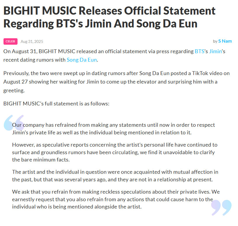ទន្ទឹមនោះដែរ BigHit ក៏បានស្នើឱ្យមហាជនកុំធ្វើ “ការសន្និដ្ឋានណាមួយដោយគ្មានមូលដ្ឋាន” ពាក់ព័ន្ធជីវិតឯកជនរបស់ Jimin និងចៀសវាងសកម្មភាពដែលអាចប៉ះពាល់ដល់ Song Da-eun ផងដែរ ៕
