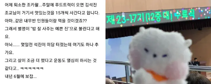 អ្នកគាំទ្ររបស់ BTS ម្នាក់នោះបានឲ្យដឹងទៀតថា៖ នៅកន្លែងហ្វឹកហាត់បំពេញការងារតែងតែមានឡានលក់អាហារជាច្រើនមកលក់សម្រាប់អ្នកនៅទីនោះទិញ។ Jin តែងទិញអាហារជាច្រើនសម្រាប់មិត្ដរួមការងាររបស់លោក។ Jin ពិតជាមានទឹកចិត្តល្អ និងចេះចែករំលែកដល់អ្នកជុំវិញ។