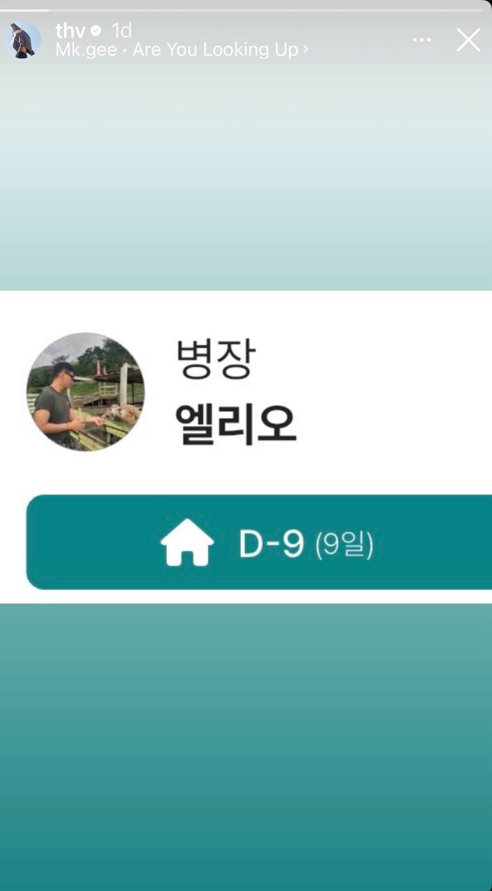 ជាក់ស្ដែងលោកបានបង្ហោះរូបភាព screenshot នៃកម្មវិធីរាប់ថយក្រោយមួយសន្លឹកនៅលើ Instagram Story របស់លោកកាលពីថ្ងៃទី១ ខែមិថុនា កន្លងទៅ ដោយបញ្ជាក់ថា “Sergeant Elio D-9” ដែលបង្ហាញពីការរាប់ថយក្រោយមុនពេលលោកត្រឡប់មកវិញនៅថ្ងៃទី១០ ខែមិថុនា ឆ្នាំ២០២៥។ ក្នុងនោះ V បានផ្លាស់ប្ដូរ Profile picture របស់លោកកំពុងពាក់ឯកសណ្ឋាន និងឱ្យចំណីចៀមដែលបង្កឱ្យមានការចង់ដឹងចង់ឮពីសំណាក់អ្នកគាំទ្រ ជាពិសេសគឺឈ្មោះ Sergeant Elio តែម្ដង។