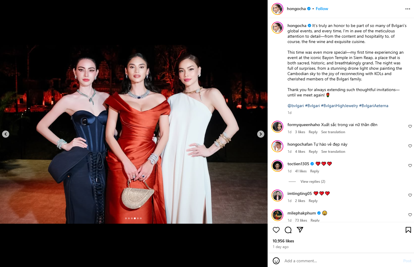 តារាចម្រៀងនិងម៉ូដែលវៀតណាម Ho Ngoc Ha បានរៀបរាប់ប្រាប់អ្នកតាមដានជាង ៣,៥ លាននាក់របស់ខ្លួនលើ Instagram ថា៖ ពិតជាកិត្តិយសណាស់សម្រាប់ខ្ញុំដែលបានក្លាយជាផ្នែកមួយនៃព្រឹត្តិការណ៍សកលរបស់ Bvlgari ហើយខ្ញុំពិតជាស្ញប់ស្ញែងនឹងការយកចិត្តទុកដាក់យ៉ាងម៉ត់ចត់ចំពោះគ្រប់យ៉ាងចាប់ពីខ្លឹមសារ និងបដិសណ្ឋារកិច្ចរហូតដល់ម្ហូបអាហារនិងស្រាដ៏ប្រណិត។ លើកនេះរឹតតែពិសេស ពោលនេះគឺលើកទីមួយរបស់ខ្ញុំ ដែលបានចូលរួមព្រឹត្តិការណ៍នៅប្រាសាទបាយ័ន ក្នុងខេត្តសៀមរាប ជាកន្លែងដ៏ពិសិដ្ឋ ពោរពេញដោយប្រវត្តិសាស្ត្រ និងភាពអស្ចារ្យ។ កម្មវិធីរាត្រីនោះពិតជាពោរពេញដោយភាពភ្ញាក់ផ្អើល រួមទាំងការសម្ដែង Show Drone ដ៏អស្ចារ្យគូរលើផ្ទៃមេឃកម្ពុជា និងភាពរីករាយនៃការភ្ជាប់ទំនាក់ទំនងជាមួយ KOLs និងសមាជិកគ្រួសារ Bvlgari ។