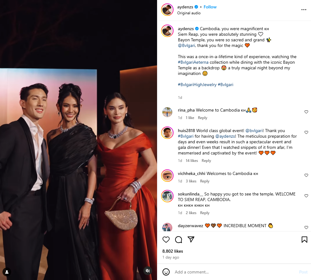 តារាសម្ដែងប្រុសសិង្ហបុរី Ayden Sng វិញបានសរសេររៀបរាប់ថា៖ “កម្ពុជាអ្នកអស្ចារ្យណាស់!សៀមរាប អ្នកពិតជាអស្ចារ្យមែន! ប្រាសាទបាយ័ន អ្នកពិតជាពិសិដ្ឋ និងអស្ចារ្យណាស់។ អរគុណ @Bvlgari សម្រាប់កម្មវិធីដ៏អស្ចារ្យនេះ។ នេះជាបទពិសោធន៍ដ៏មានតម្លៃមួយក្នុងជីវិត ទស្សនាការបង្ហាញម៉ូដ #BvlgariAeterna ទទួលទានអាហារដោយមានទិដ្ឋភាពប្រាសាទបាយ័នខាងក្រោយ ពិតជារាត្រីដ៏អស្ចារ្យហួសពីការស្មានរបស់ខ្ញុំ។ អរគុណរដ្ឋាភិបាលកម្ពុជា និង @Bvlgari ដែលធ្វើឱ្យព្រឹត្តិការណ៍នេះកើតឡើង”។