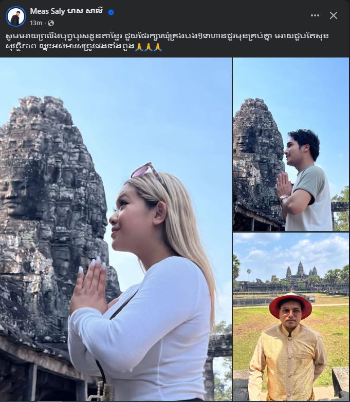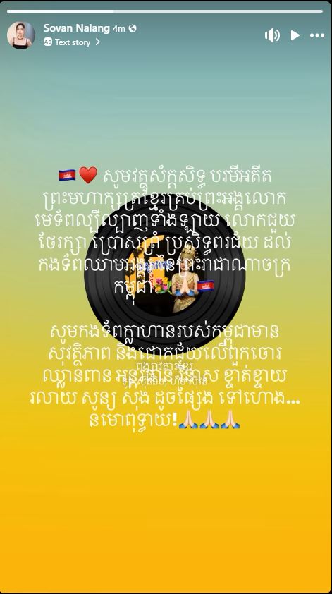 អ្នកនាង មាស សុខសោភា ៖ «សូមទេវតា ម្ចាស់ទឹកម្ចាស់ដី និងដួងព្រលឹងបុព្វបុរសខ្មែរគ្រប់ជំនាន់ ជួយតាមថែរក្សាកងទ័ពកម្ពុជា ឲ្យមានសុខភាពល្អ ការពារទឹកដី ឈ្នះអស់មាសត្រូវ»។