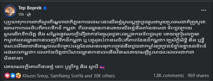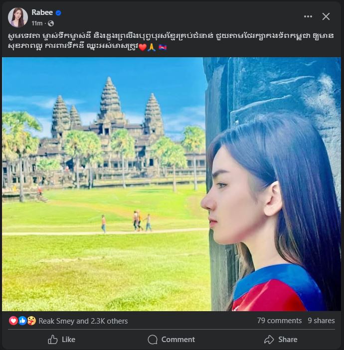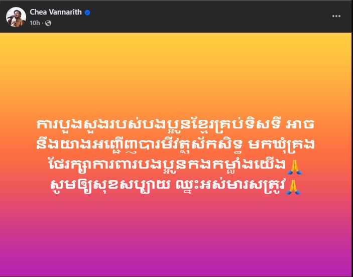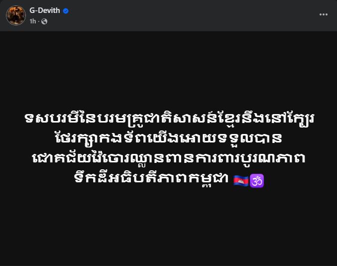 ក្នុងនោះឃើញមានអ្នកនាង ទេព បូព្រឹក្ស និងលោក ជី ដេវីត ជាមួយខ្លឹមសារដែលបានបង្ហោះថា៖ «បុព្វហេតុកាពារជាតិស្មារតីស្នេហាជាតិក្នុងកាលទេសៈនេះយេីងខ្ញុំសូមប្តេជ្ញាចូលរួមជាមួយប្រទេសជាតិត្រូវបូជាឈាមកាពារអធិបតីភាពទឹកដីកម្ពុជាពីចោរឈ្លានពានដោយយេីងខ្ញុំនឹងតាំងនាមជាទ័ពជួរក្រោយសូមលេីកទឹកចិត្ត និងសម្តែងនូវសេចក្ដីជឿជាក់ទាំងស្រុងជូនបងប្អូនកងទ័ពជួរមុខ ដោយត្រៀមលក្ខណកម្ចាត់ចោរឈ្លានពានចេញពីទឺកដីកម្ពុជា ឬ បម្រុងបំពានអធិបតីភាពដែនដីកម្ពុជា។ វត្ថុស័ក្ដិសិទ្ធិ និង ឬទ្ធីទសបរមីនៃរាជានិងស្តេចមេទ័ពគ្រប់អង្គដែលមានអនុភាពទ្រង់នឹងជួយជាកម្លាំងទ្រទ្រង់ដ៏ខ្លាំងខ្លាដល់ទ័ពដ៏អង់អាចកម្ពុជា។ ចោរតាំងចិត្តជាបិសាចឈ្លានពានចោរនឹងវិនាសដោយសេក្តីប្រមាថរបស់ចោរជាក់ជាមិនខាន»។
