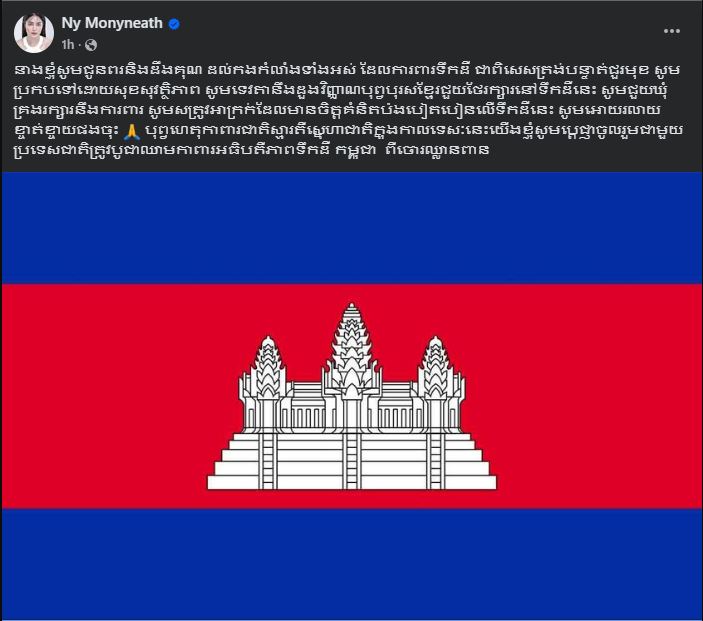 តារាសម្ដែង នី មុនីនាថ ៖ «នាងខ្ញុំសូមជូនពរនិងដឹងគុណ ដល់កងកំលាំងទាំងអស់ ដែលការពារទឹកដី ជាពិសេសត្រង់បន្ទាត់ជួរមុខ សូមប្រកបទៅដោយសុខសុវត្ថិភាព សូមទេវតានឹងដួងវិញ្ញាណបុព្វបុរសខ្មែរជួយថែរក្សារនៅទឹកដីនេះ សូមជួយឃុំគ្រងរក្សារនឹងការពារ សូមសត្រូវអាក្រក់ដែលមានចិត្តគំនិតប៉ងបៀតបៀនលើទឹកដីនេះ សូមអោយរលាយខ្ចាត់ខ្ចាយផងចុះ បុព្វហេតុកាពារជាតិស្មារតីស្នេហាជាតិក្នុងកាលទេសៈនេះយេីងខ្ញុំសូមប្តេជ្ញាចូលរួមជាមួយប្រទេសជាតិត្រូវបូជាឈាមកាពារអធិបតីភាពទឹកដី កម្ពុជា ពីចោរឈ្លានពាន»។