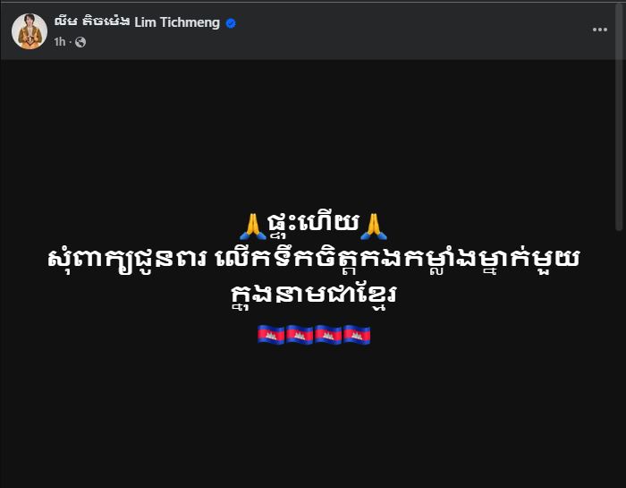 ពិតជាស្រុះដៃគ្នាល្អណាស់សិល្បករខ្មែរច្រើននាក់បាននាំគ្នាបង្ហោះសារលើកទឹកចិត្តដល់កងទ័ពជួរមុខយ៉ាងផុលផុសនៅលើបណ្ដាញសង្គមក្រោយកើតមានបញ្ហាចម្រូងចម្រាសដោយភាគីថៃមកលើកម្ពុជានាពេលថ្មីៗនេះ។ បញ្ហាក្ដៅគគុកនៅតាមខ្សែបន្ទាត់ព្រំដែនកម្ពុជា-ថៃ បានកំពុងកើតឡើងដែលបង្កជាការព្រួយបារម្ភយ៉ាងខ្លាំងទៅដល់ប្រជាជននៃប្រទេសទាំងពីរជាពិសេសសកម្មភាពយ៉ាងគឃ្លើនរបស់កងទ័ពថៃដែលគំរាមបិទច្រកប្រាសាទតាមាន់ធំដោយឯកតោភាគី និងការបាញ់បោះមកលើកងទ័ពកម្ពុជានាព្រឹកថ្ងៃទី ២៤ ខែ កក្កដា មុននេះបន្តិច។