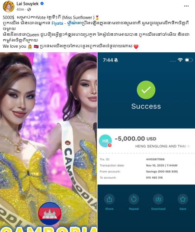 ថៅកែឡេអនឡាញដ៏មានឈ្មោះល្បីល្បាញ ឡៃ ស៊ូយៀក បានចំណាយថវិកា ៥ ពាន់ដុល្លារ សម្រាប់ការបោះឆ្នោតឲ្យ ថៃ នារីសុជាតា Miss Universe Cambodia 2025 ដើម្បីចូលទៅកាន់ Top ជ្រៅណាមួយនៃកម្មវិធី Miss Universe 2025 ដែលកំពុងរៀបចំឡើងនៅប្រទេសថៃ។
