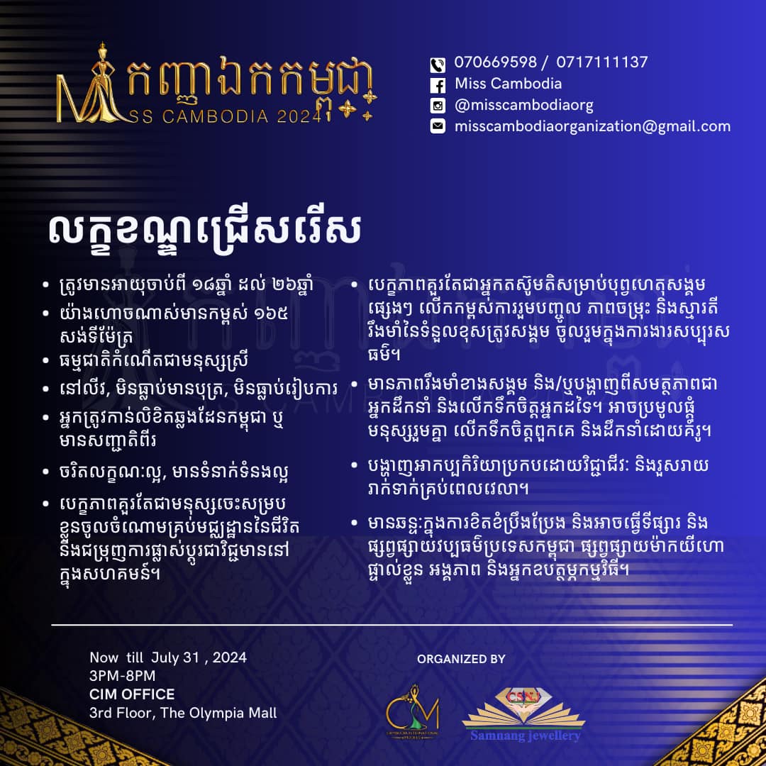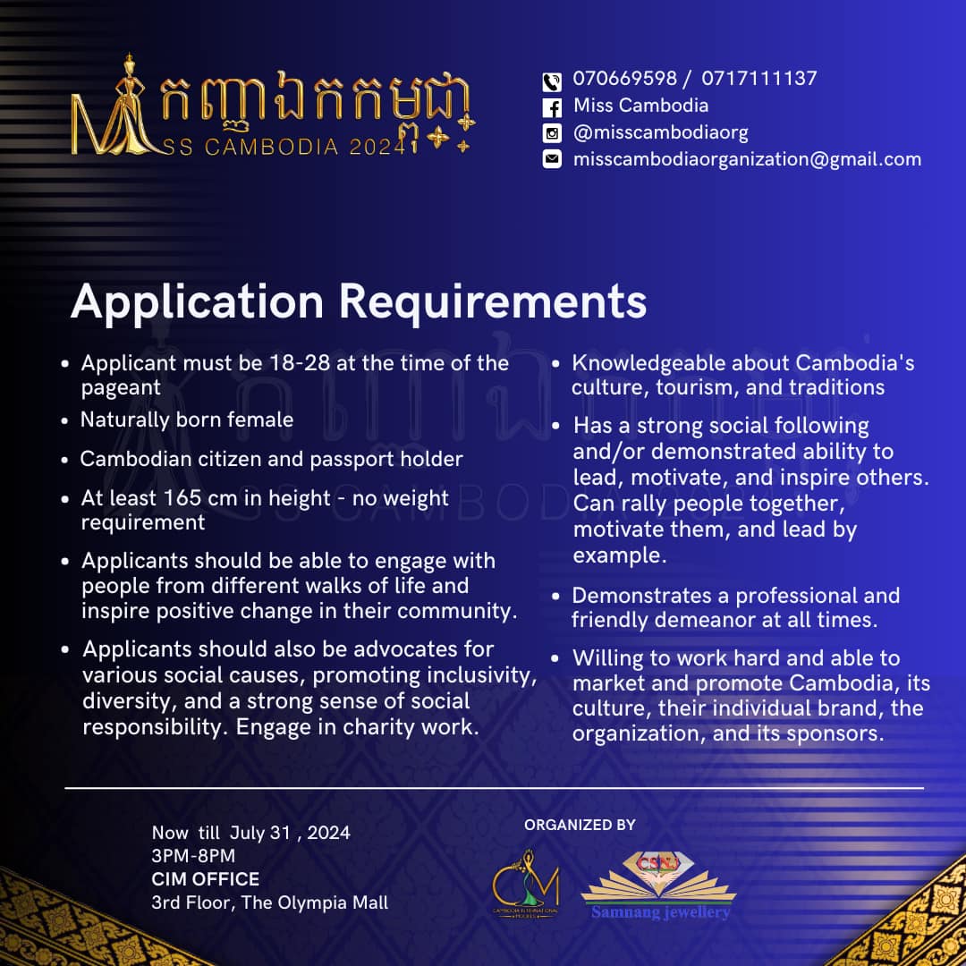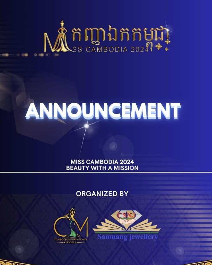 សូមជម្រាបផងដែរថា ក្រុមហ៊ុន Cambodia International Models នៅបន្តទទួលពាក្យប្រកួត Miss Cambodia 2024 ពីថ្ងៃនេះរហូតដល់ចុងខែកក្កដា ឆ្នាំ ២០២៤ ហើយការប្រកួតផ្តាច់ព្រ័តនឹងធ្វើឡើងនៅថ្ងៃទី៣០ ខែសីហា ឆ្នាំ ២០២៤ ខាងមុខ។ សុភាពនារីទាំងឡាយ ដែលមានបំណងចង់ដាក់ពាក្យចូលរួមប្រកួតកម្មវិធី Miss Cambodia 2024 អាចទំនាក់ទំនងទៅកាន់ទំព័រហ្វេសប៊ុកផ្លូវការ Cambodia International Models និង Miss Cambodia៕
