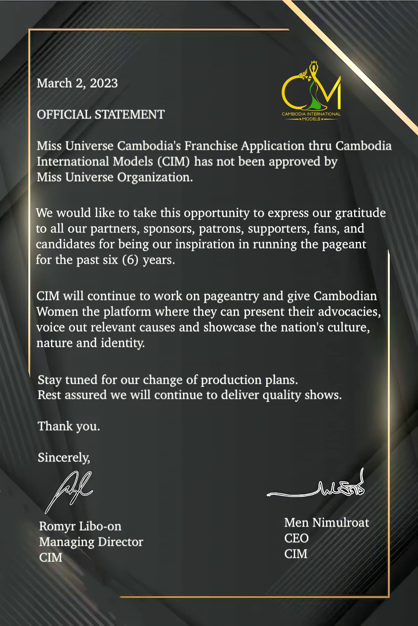 លោក ម៉ែន និមលរតន៍ នាយកប្រត្តិបត្តិក្រុមហ៊ុន CIM ប្រាប់ឱ្យ AMS ដឹងយ៉ាងខ្លីថា ឆ្នាំនេះយើងដាក់ពាក្យស្នើរសុំតាមទម្រង់បែបបទដូចរាល់ឆ្នាំ ស្រាប់តែស្ថាប័ន Miss Universe ឆ្លើយតបមកថា មិនផ្តល់សិទ្ធិឱ្យកម្ពុជាយើងធ្វើ ដូច្នេះ ក្រុមហ៊ុនមានតែភាពសោកស្តាយ និងប្រកាសឱ្យអ្នកគាំទ្រដឹងតាមដំណើររឿងដូច្នោះដែរ។