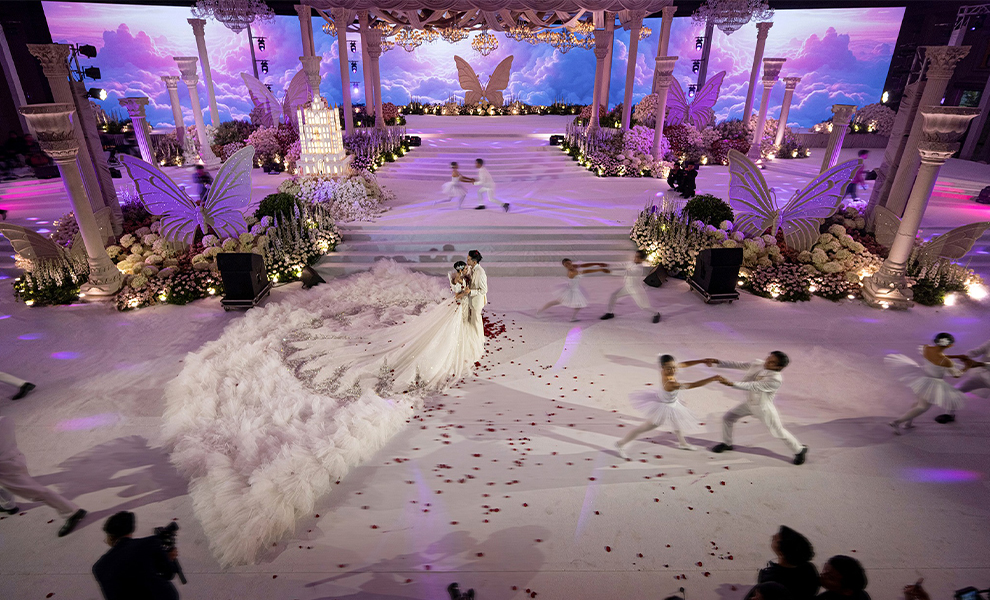 ឈុតកាត់នំដែលសម្រិតសម្រាំងជាពិសេសដោយភ្ជាប់ជាមួយរចនាបថប្រាសាទបុរាណខ្មែរបានលេចវត្តមានក្នុងថ្ងៃមង្គលតារាចម្រៀងល្បីឈ្មោះ ទេព បូព្រឹក្ស និង ជី ដេវីត ។ ជាឈុតកូនក្រមុំដែលស្រស់ស្អាត និងទាក់ទាញបំផុតមិនធ្លាប់មានពីមុនមក។