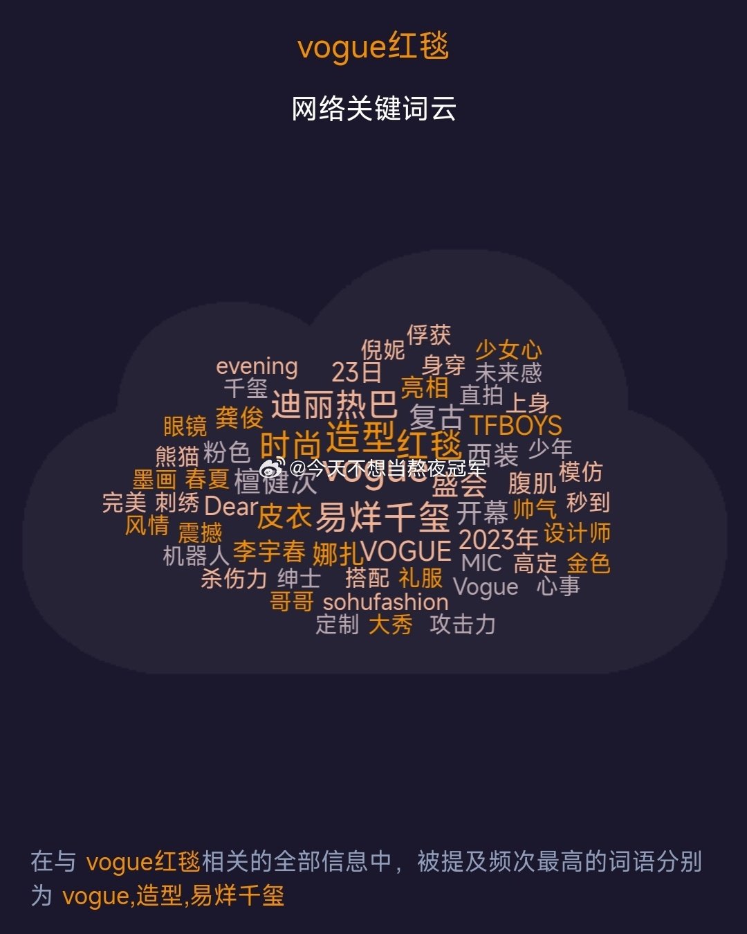 នៅរាត្រីថ្ងៃទី ២៣ ខែ វិច្ឆិកា ឆ្នាំ ២០២៣ តារាសម្ដែងចិនល្បីៗជាច្រើនរូបបានបង្ហាញខ្លួនក្នុងកម្មវិធី Vogue Forces Of Fashion នៅឯទីក្រុងសៀងហៃ ប្រទេសចិន។ ក្នុងឱកាសនោះដែរ តារាដែលមានវត្ដមាននៅទីនោះនាំគ្នាតុបតែងខ្លួនលេងស្ទីលប្លែកៗពីគ្នា។