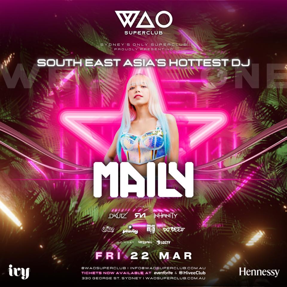 ជាកិត្តិយសដ៏ធំធេងសម្រាប់ DJ ស្រីល្បីឈ្មោះលំដាប់ប្រទេស កញ្ញា ម៉ៃលី ដោយនាងត្រូវបាន WAO Superclub ដែលជាក្លឹបលំដាប់ថ្នាក់ពិភពលោកអញ្ញើញឱ្យទៅចាក់ភ្លេង កាលពីថ្ងៃ ២២ ខែមីនា ឆ្នាំ ២០២៤ កន្លងទៅ។ វត្តមាន ម៉ៃលី សម្តែងក្នុងក្លឹប WAO Superclub ផ្តល់នូវភាពសប្បាយរីករាយដល់អ្នកចូលរួមគ្រប់ជាតិសាសន៍ រួមទាំងប្រជាជនខ្មែររស់នៅទីនោះផងដែរ។
