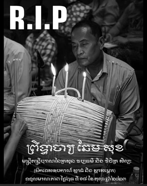 ក្នុងរូបថតកាន់ទុក្ខរបស់ព្រឹទ្ធាចារ្យ ឆែម សុខ បានបញ្ជាក់ឱ្យដឹងថា ព្រឹទ្ធាចារ្យ ឆែម សុខ ជាមន្ត្រីតន្ត្រីបុរាណនៃក្រសួងវប្បធម៌ និងវិចិត្រសិល្បៈ ឯកទេសឧបករណ៍ស្គរធំ និងស្គរសម្ភោរ។