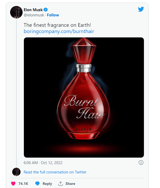 ងាកទៅទឹកអប់ Burnt Hair វិញ Elon Musk ដាក់លក់ក្នុងតម្លៃ ១ដប ១០០ដុល្លារ ហើយនឹងផ្ញើទៅដល់ដៃអ្នកកុម្ម៉ង់នៅដើមឆ្នាំ ២០២៣។ Musk ក៏បានសរសេរបញ្ជាក់ វាជាទឹកអប់សម្រាប់បុរស ដែលជួយឲ្យពួកគេទាក់ទាញនៅក្នុងចំណោមមនុស្សច្រើន និងគេចាប់អារម្មណ៍នៅប្រលានយន្តហោះ។ លើសពីនេះទៅទៀត បុរសបច្ចេកវិទ្យារូបនេះក៏បានផ្លាស់ប្ដូរ Bio នៅក្នុងគណនី Twitter របស់លោកថា បុរសលក់ទឹកអប់ផងដែរ។