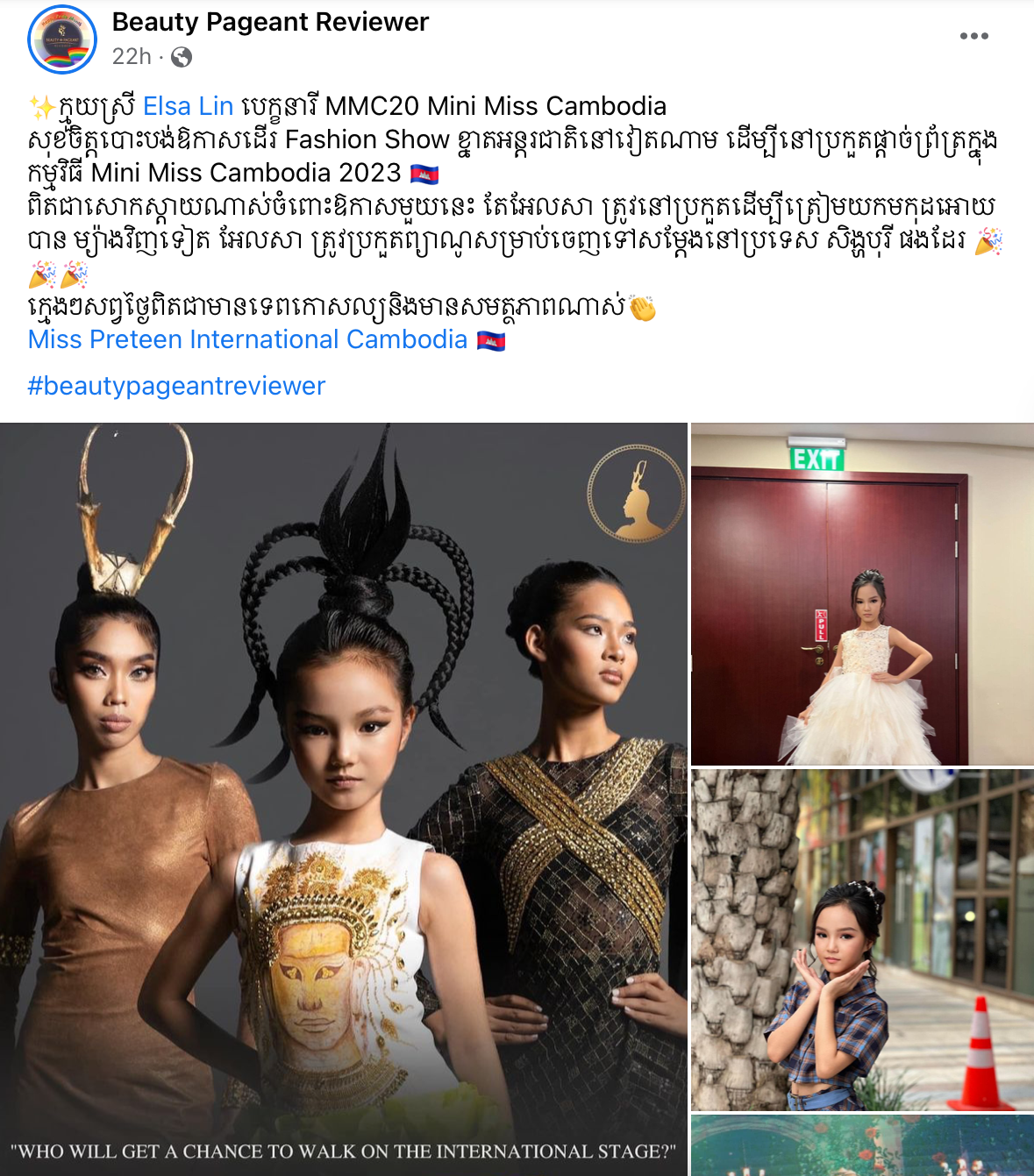 ហ្វេនផេក Beauty Pageant Reviewer ដែលគាំទ្រវិស័យបវរកញ្ញានៅកម្ពុជា បានបង្ហាញការសោកស្តាយដែលកុមារីវ័យ ៩ ឆ្នាំនេះ បាត់បង់ឱកាសចេញទៅដើរម៉ូដលំដាប់អន្តរជាតិនៅវៀតណាម តែយ៉ាងណានាងត្រូវនៅប្រកួតដើម្បីត្រៀមយកមកុដនៅខ្មែរសិន។ ម្យ៉ាងវិញទៀត អែលសា ក៏ត្រូវប្រកួតព្យាណូ សម្រាប់ចេញទៅសម្តែងនៅសិង្ហបុរីផងដែរ។