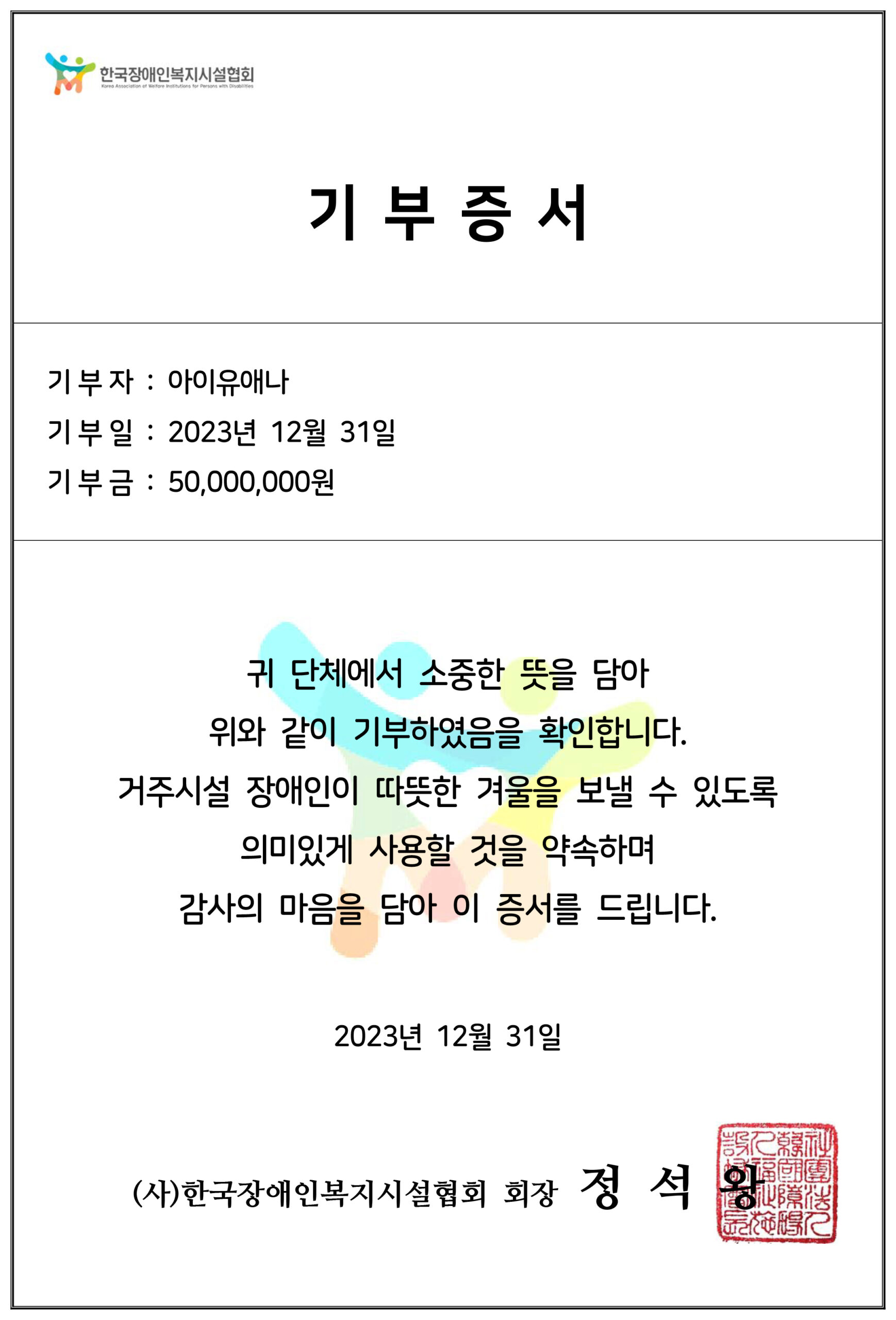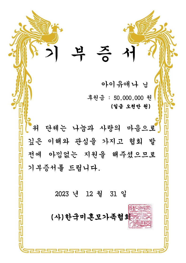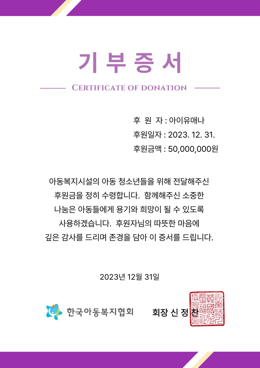 កាលពីថ្ងៃទី០១ ខែមករា ឆ្នាំ២០២៤ IU បានបង្ហោះវិញ្ញាបនបត្រនៅលើបណ្ដាញសង្គម X ដោយនាងបានបានបរិច្ចាគថវិកាសរុបចំនួន ២០០ លានវ៉ុន (១៥ម៉ឺនដុល្លារ) ដើម្បីជួយទៅដល់អង្គការចំនួន ៤ រួមទាំងសមាគមសុខុមាលភាពពលរដ្ឋវ័យចំណាស់ប្រចាំប្រទេសកូរ៉េខាងត្បូងផងដែរ។
