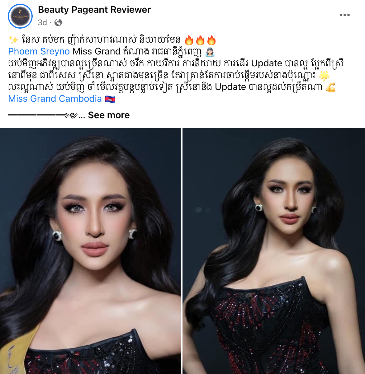 ចំណែក ហ្វេនផេក Beauty Pageant Reviewer ក៏បានបង្ហាញការយល់ឃើញលើ ស្រីនោ ថា«នែស គប់មក ញ៉ាក់សាហាវណាស់ និយាយមែនPhoem Sreyno Miss Grand តំណាង រាជធានីភ្នំពេញយប់មិញអភិវឌ្ឍបានល្អច្រើនណាស់ ចរិក កាយវិការ ការនិយាយ ការដើរ Update បានល្អ ប្លែកពីស្រីនោពីមុន ជាពិសេស ស្រីនោ ស្អាតជាងមុនច្រើន តែវាគ្រាន់តែការចាប់ផ្តើមរបស់នាងប៉ុណ្ណោះ លះល្អណាស់ យប់មិញ ចាំមើលវគ្គបន្តបន្ទាប់ទៀត ស្រីនោនិង Update បានល្អដល់កម្រិតណា»។ រីឯ អេនណា វិញនោះត្រូវហ្វេនផេកនេះពោលពាក្យយ៉ាងខ្លីថា «ព្យុះមកហើយ Koy Anna»។