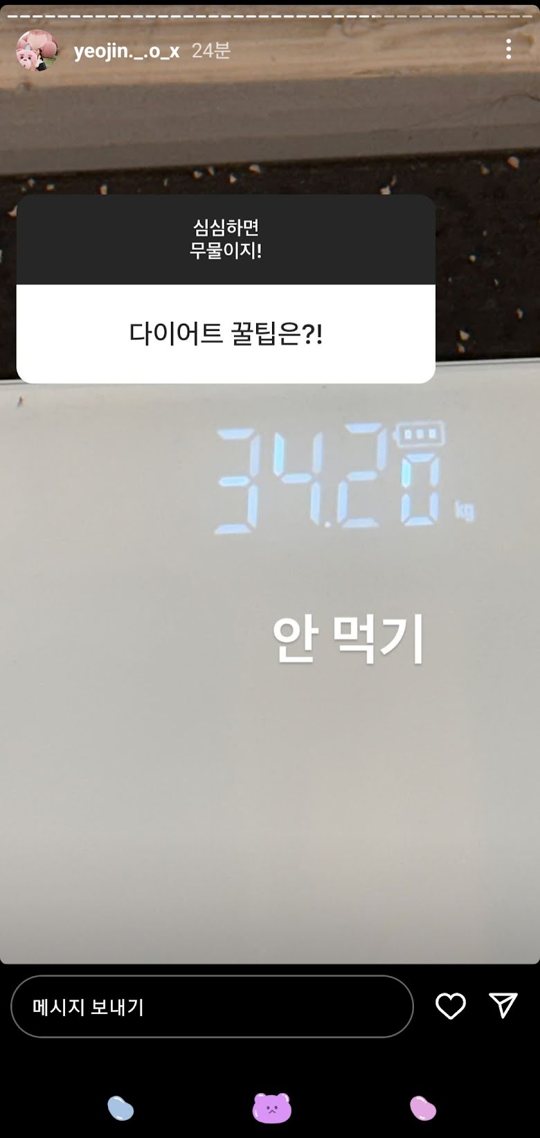 ជាការឆ្លើយតប YeoJin បានលើកឡើងថា៖ នាងមិនបានញ៉ាំអ្វីឡើយទើបស្រកគីឡូដូច្នេះ គឺសឹងតែមិនហូបអ្វីទាំងអស់។ កាលពីមុន YeoJin ក៏ធ្លាប់បានលើកឡើងពីរបបអាហាររបស់នាងដែរថា នាងហូបតែដំឡូងបារាំងស្ងោរចំនួន ២ ដុំតូចៗ សាច់ទ្រូងមាន់មួយដុំតូច និងផ្លែទំពាំងបាយជូរពីរគ្រាប់ប៉ុណ្ណោះ នៅពេលតមអាហារ។ ក្រៅពីនេះ នាងក៏មានរត់ហាត់ប្រាណផងដែរ។