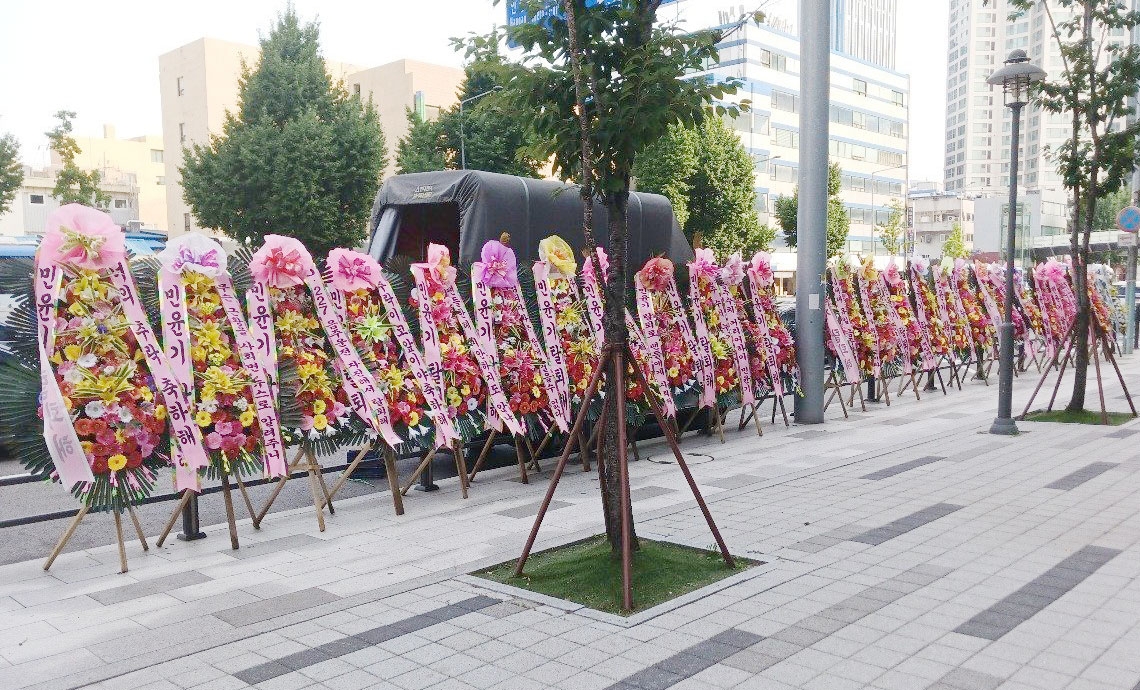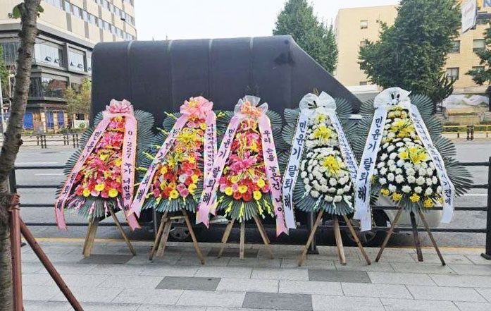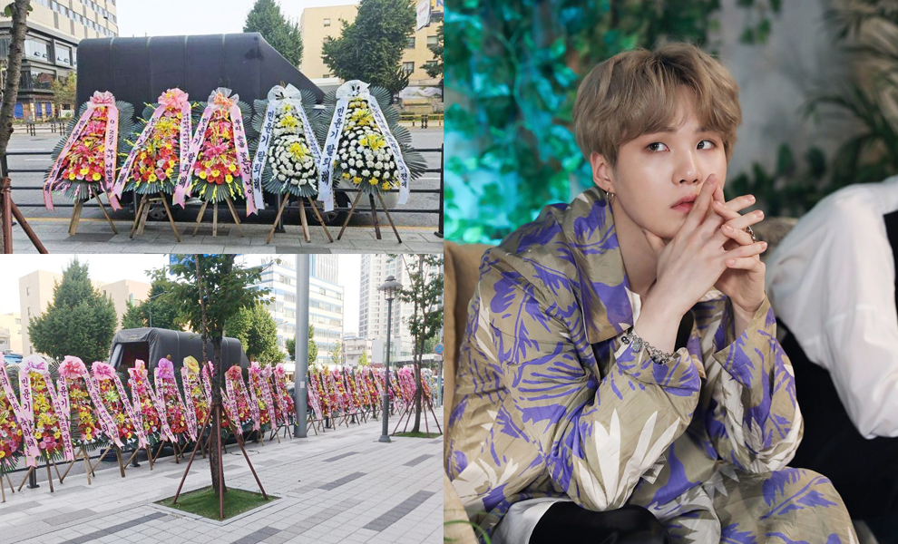 កម្រងផ្កាជាច្រើនត្រូវបានដាក់តម្រៀបជួរនៅមុខទីស្នាក់ការកណ្តាលក្រុមហ៊ុន HYBE ក្នុងទីក្រុងសេអ៊ូល កាលពីថ្ងៃអង្គារ ដោយទាមទារឱ្យ តារាចម្រៀង Min Yoon-gi ឬ Suga ក្រុម BTS ចាកចេញពីក្រុម បន្ទាប់ពីមានករណីបើកបរក្នុងស្ថានភាពស្រវឹងកាលពីសប្តាហ៍មុន។
