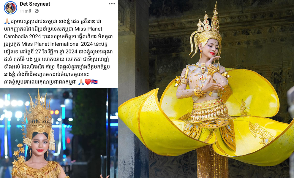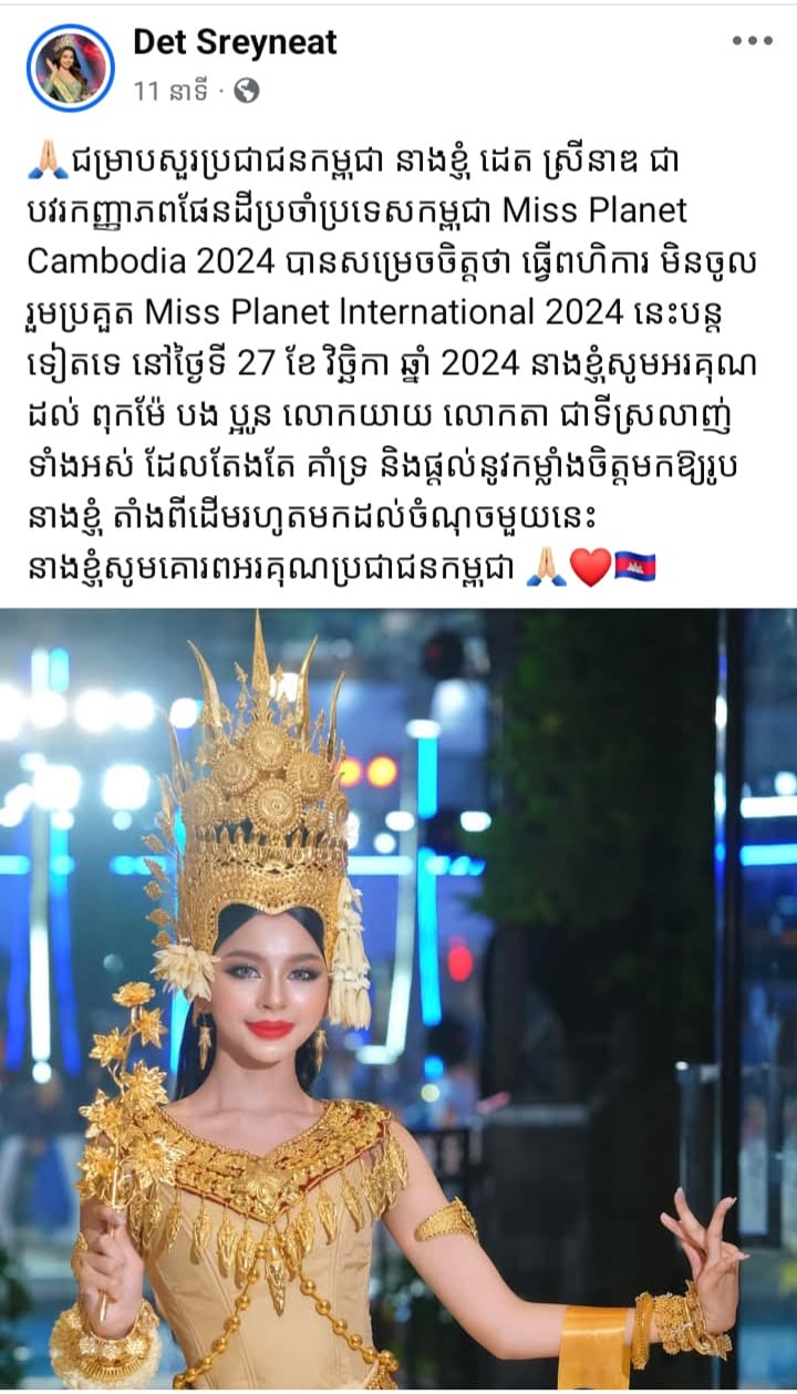 មុននេះបន្តិច Miss Planet Cambodia 2024 ដេត ស្រីនាឌ បានប្រកាសធ្វើពហិការមិនចូលរួមប្រកួត ផ្ដាច់ព្រ័ត្រ Miss Planet International យប់នេះ ដែលដំណឹងមួយនេះ ធ្វើឲ្យអ្នកគាំទ្រមិនសប្បាយចិត្តឡើយ។