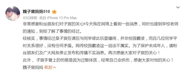 បើទោះជាមានការបកស្រាយពីម្ដាយរបស់ Wei Zichen ពិតមែន ប៉ុន្តែអ្នកគាំទ្រមួយចំនួនធំបានបង្ហាញការហួសចិត្ត និងនៅតែទទួលយកចម្លើយមួយនេះដោយគេគិតថាគាត់អាចនឹងទទួលបានការគំរាមកំហែង ឬមានរឿងផ្សេងទៀតណាមួយនៅពីក្រោយខ្នងថែមទៀតផង។ ដូច្នេះទើបពួកគេលើកទឹកចិត្តឱ្យគាត់មានភាពក្លាហានក្នុងការបញ្ចេញវាចេញមកក្រៅដើម្បីជួយដល់ Wei Zichen៕