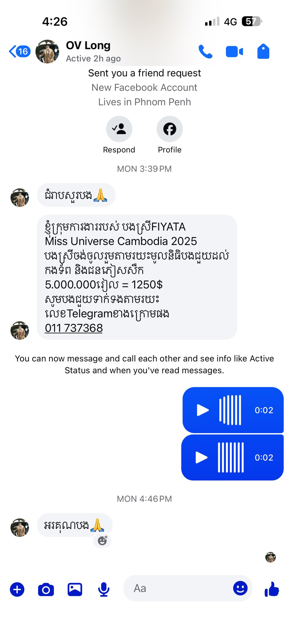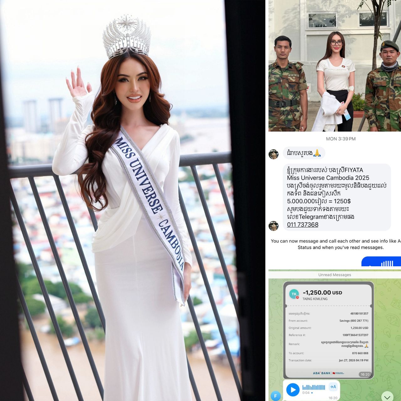 ជាមួយគ្នា អ្នកនាង ហ្វីយ៉ាតា ដែលមហាជនស្គាល់ថាជា Miss Universe Cambodia 2025 បានចាត់ចែងក្រុមការងារឱ្យទាក់ទងជាបន្ទាន់ទៅកាន់លោក តាំង គឹមឡេង ហើយបានធ្វើការបាញ់ថវិកាចំនួន ១,២៥០ ដុល្លារ ដែលស្មើនិង ៥ លានរៀលដើម្បីជាចំណែកជួយដល់កងទ័ពនិងជនភៀសសឹកខ្វះខាត។