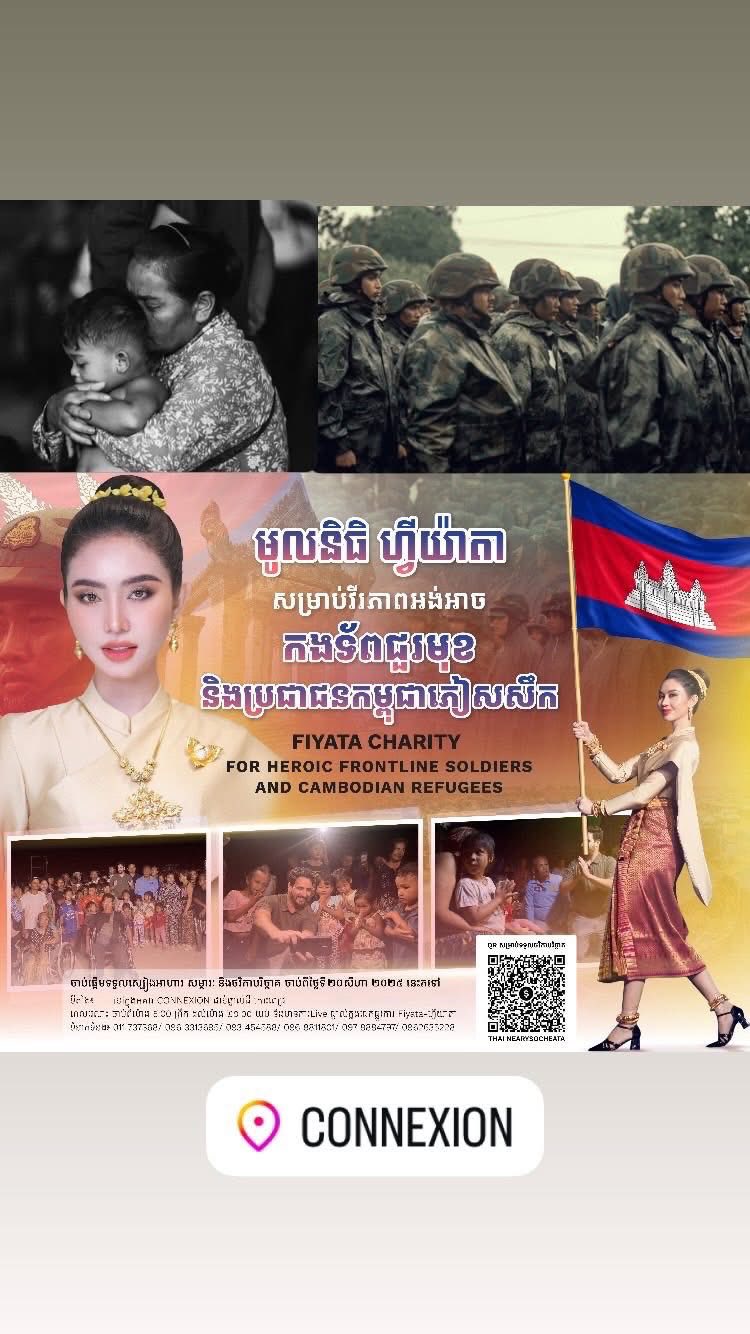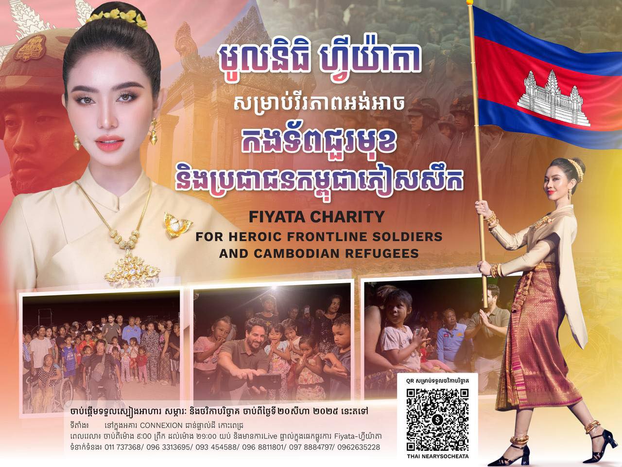 បេក្ខភាព MISS UNIVERSE CAMBODIA 2025 ហ្វីយ៉ាតា បានប្រកាសកៀរគរស្វែងរកជំនួយបន្តជួយដល់កងទ័ព និងជនភៀសសឹកកម្ពុជា។ ចំពោះទីតាំងទទួលស្បៀងក៏ដូចជាសម្ភារៈជំនួយអ្នកនាងបានរៀបចំនៅ Connexion កោះពេជ្រ ដោយចាប់ផ្ដើមពីថ្ងៃ ២០ សីហា ២០២៥ តទៅពីម៉ោង ៩ព្រឹកដល់៨យប់។
