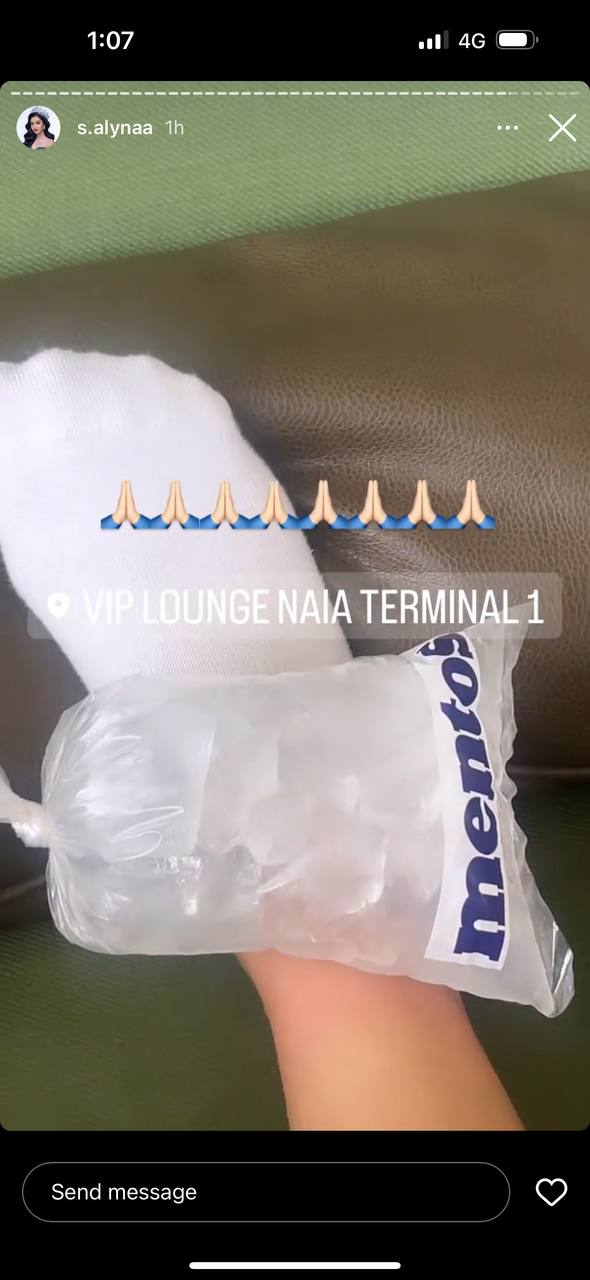 តាមការបញ្ជាក់លើ Story របស់ អេលីណា ពេលនេះជើងរបស់នាងនៅហើមនៅឡើយ តែបានគុណបុណ្យព្រះជួយ ពេលកំពុងរង់ចាំនៅព្រលានយន្តហោះហ្វីលីពីន មានបុរសចិត្តធម៌ម្នាក់បានយកទឹកកកមកឱ្យនាងស្អំជើង ដើម្បីបំបាត់ការឈឺចាប់តាមផ្លូវ។ នាងពិតជាអរគុណសម្មានចិត្តរបស់បរុសម្នាក់នោះខ្លាំងណាស់ ដែលបានយកទឹកកកមកឱ្យនាងស្អំបន្តគ្នារហូត ទាំងដែលនាងបានសុំគាត់តែម្តងប៉ុណ្ណោះ។