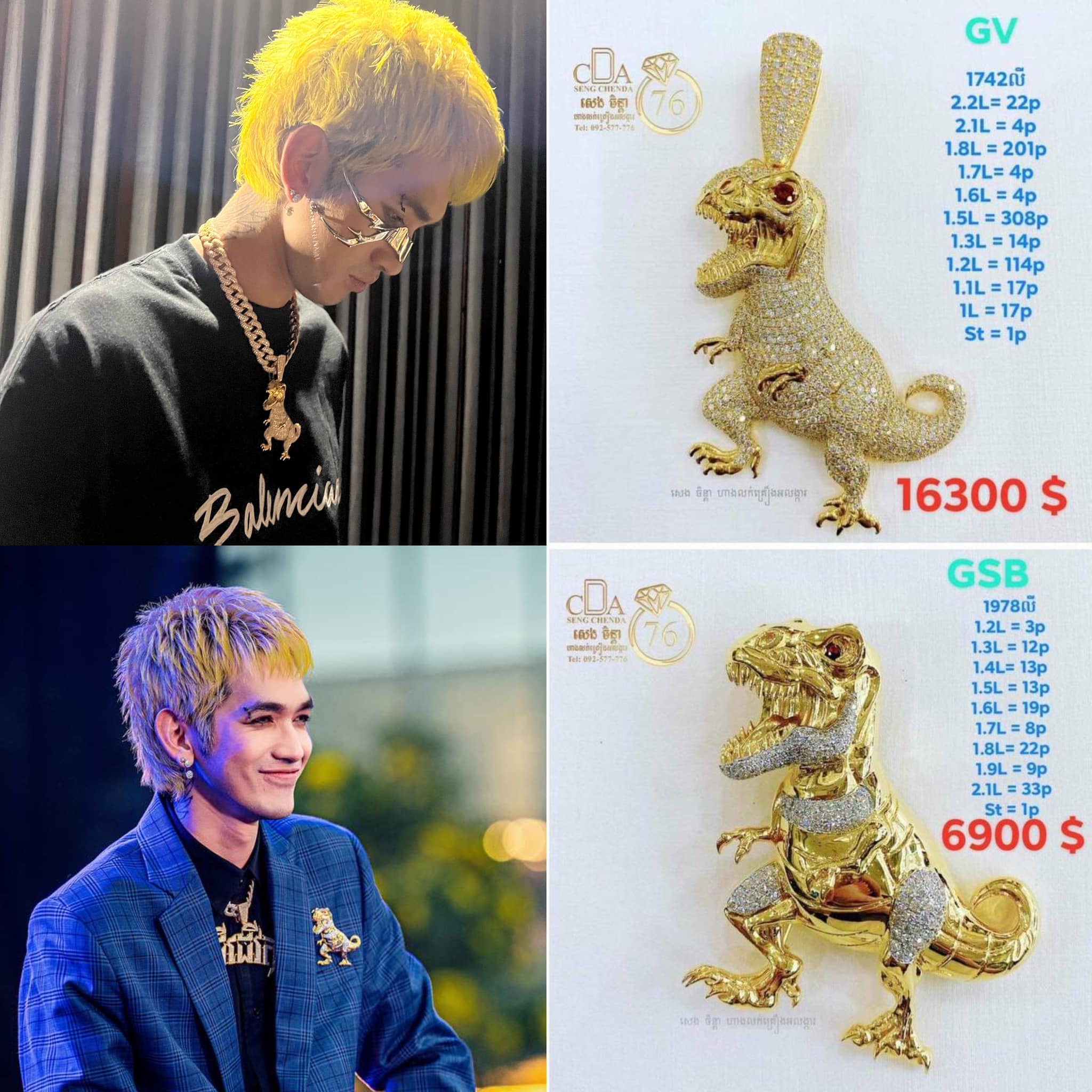 - បណ្តោងខ្សែកររូបសត្វដាយណូស័រ និងខ្ទាស់អាវរូបដាយណូស័រ ជាការរចនាពិសេសដោយហាងពេជ្រ Seng Chenda។ ក្នុងនោះ បណ្តោងខ្សែកររូបសត្វដាយណូស័រ តម្លៃ ១៦ ៣០០ ដុល្លារ ចំណែក ខ្ទាស់អាវរូបដាយណូស័រ តម្លៃ ៦ ៩០០ ដុល្លារ សរុបជាង ២ ម៉ឺនដុល្លារ។