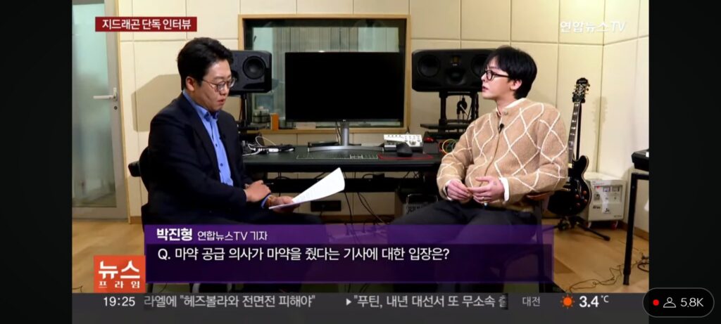 រឿងរ៉ាវដែលតារាចម្រៀងខេប៉ុបល្បី G-Dragon ត្រូវបានគេសង្ស័យជាប់ពាក់ព័ន្ធប្រើប្រាស់គ្រឿងញៀននៅតែជាប្រធានបទត្រូវគេលើកយកមកជជែកវែកញែកជាសាធារណៈ។ ជាបន្ដបន្ទាប់ លទ្ធផលតេស្ដសារធាតុញៀនក្នុងខ្លួនតារាប្រុសវ័យ ៣៥ រូបនេះទាំងសក់ ក្រចក និងទឹកនោម បានបញ្ចេញជាផ្លូវការ សុទ្ធតែបញ្ជាក់ថា អវិជ្ជមាន។ ជាមួយគ្នាដែរ បទសម្ភាសន៍របស់លោកជាមួយខាងសារព័ត៌មានកូរ៉េ Yonhap News វគ្គ ២ ក៏បានបញ្ចេញជាផ្លូវការ។