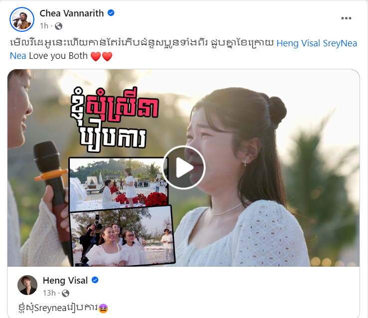 ហេង វិសាល និង ស្រីនា ជាគូស្នេហ៍ដែលហ្វេនគាំទ្រខ្លាំង និងចង់ឲ្យអ្នកទាំង២ ចូលរោងការឆាប់ៗ ហើយថ្មីៗនេះអនាគតកូនកំលោះរូបនេះ ទើបរៀបចំកម្មវិធី Proposal នៅឆ្នេររាម ដើម្បីបំពេញបំណងខាងស្រីក្នុងជីវិតជាមនុស្សស្រី។