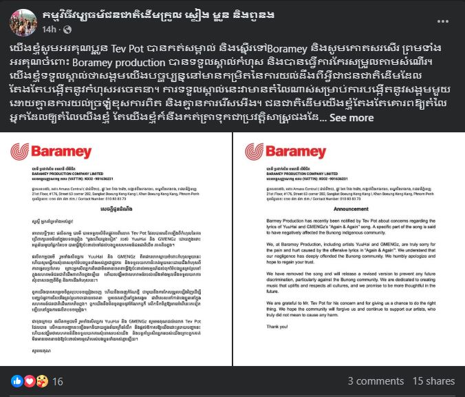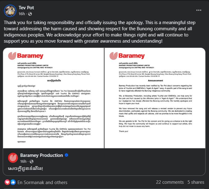 ទាំង​ផលិត​កម្ម​ បារមី ​យូ​ហៃ ​និង ​​Gmengz​​​ បាន​បង្ហាញ​ទំនួល​ខុស​ត្រូវ​ក្នុង​នាម​ជា​សិល្បករ​​នៅ​ក្នុង​វិស័យ​ចម្រៀង​រ៉េប ​ដោយ​ព្រម​ទទួល​កំហុស ​និង​ធ្វើ​ការ​សូ​មទោស​ជា​សាធារណៈ ​បន្ទាប់​ពី​ការប្រើ​ពាក្យ​ពេចន៍​នៅ​ក្នុង​បទ​ចម្រៀង ​​«​ម្ដង​ហើយ​ម្ដង​ទៀត​» ​ដែល​ទើប​ទម្លាក់​ក្ដៅ​ៗកាលពីសប្ដាហ៍មុន បាន​ធ្វើ​ឱ្យ​ប៉ះពាល់​ដល់​សហគមន៍​ជនជាតិ​ដើម​ភាគតិច​ព្នង​​។​​​​ បន្ថែម​លើ​ការ​សូមទោស​នេះ​ដែរ ​ខាង​ផលិតកម្ម​ បារមី​ បាន​សម្រេច​លុប​វីដេអូ​បទ​ចម្រៀង​ខាង​លើ​ចេញ​ពី​ក្នុង​ហ្វេសបុក​ផេក​​ ក៏​ដូច​ជា​យូធូប​ឆាណែល​ ​ដើម្បី​ចេញ​កំណែ​ថ្មី​ ជាមួយ​ការ​កែ​សម្រួល​ឡើង​វិញ​ ដើម្បី​បញ្ឈប់​ការ​រើសអើង​គ្រប់​រូបភាព​ដោយ​ចេតនា​ ឬ​អចេតនា​នៅ​ក្នុង​សង្គម ​ជា​ពិសេស​ទៅ​កាន់​បង​ប្អូន​នៅ​ក្នុង​សហគមន៍​ជន​ជាតិ​ដើម​ភាគតិច​ព្នង​។​