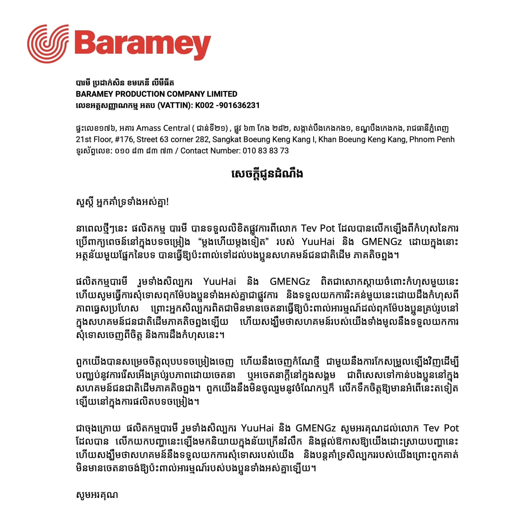 មិន​បង្អង់​យូរ​ ផលិតកម្ម​ បារមី ​បាន​ចេញ​សេចក្ដី​ប្រកាស​ភ្លាម​ៗ​លុប​បទ​ចម្រៀង​ «​ម្ដង​ហើយ​ម្ដង​ទៀត​»​ របស់ ​​យូ​ហៃ​ និង ​Gmengz​​ ក៏​ព្រោះ​តែ​ពាក្យ​ពេចន៍​ក្នុង​បទ​ចម្រៀង​មួយ​នេះ ​បាន​ធ្វើ​ឱ្យ​ប៉ះពាល់​ទៅ​ដល់​បង​ប្អូន​សហគមន៍​ជន​ជាតិ​ដើម​ភាគ​តិច​ព្នង​។​