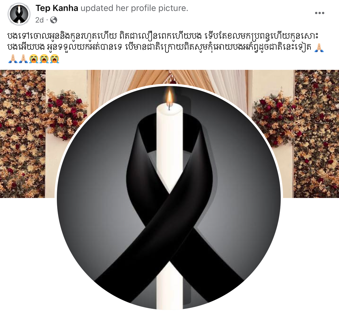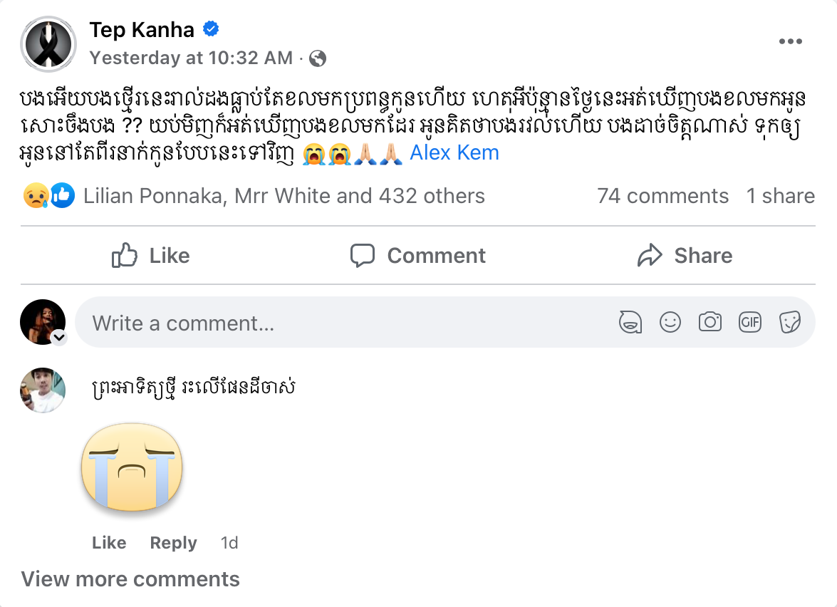 អ្នកម្តាយកូនមួយនេះ ទទួលយកមិនបានទេក្រោយបាត់បង់ស្វាមីជាទីស្រលាញ់ភ្លាមៗបែបនេះ។ នាងបានបង្ហោះសារដ៏ក្រៀមក្រំលើគណនីផ្លូវការថា «បងអើយបងហេតុអីទៅចោលអូននិងកូនមិនប្រាប់មួយមាត់បែបនេះ ??? បងជាប្តីល្អ ជាប៉ាល្អណាស់ អូនពិតជាទទួលយកមិនបានទេ យើងនៅមានរឿងជាច្រើនត្រូវធ្វើជាមួយគ្នាបង នៅតែប៉ុន្មានខែទៀតកូនយើងបានមួយខួបហើយបង យើងជិតបានទៅរស់នៅជុំគ្នាហើយ បងស្រលាញ់ប្រពន្ធ កូនណាស់ ហេតុអីក៏បងទុកអូននិងកូនចោលបែបនេះបង ?? អូននិងកូនសូមចងចាំទង្វើរល្អរបស់បងទុកក្នុងចិត្តជារាងរហូត សូមអោយបងបានទៅដល់ឋានសួគ៌ស្ងប់សុខផង បើមានជាតិក្រោយពិតយើងជួបគ្នាទៀតណាបងណា»។
