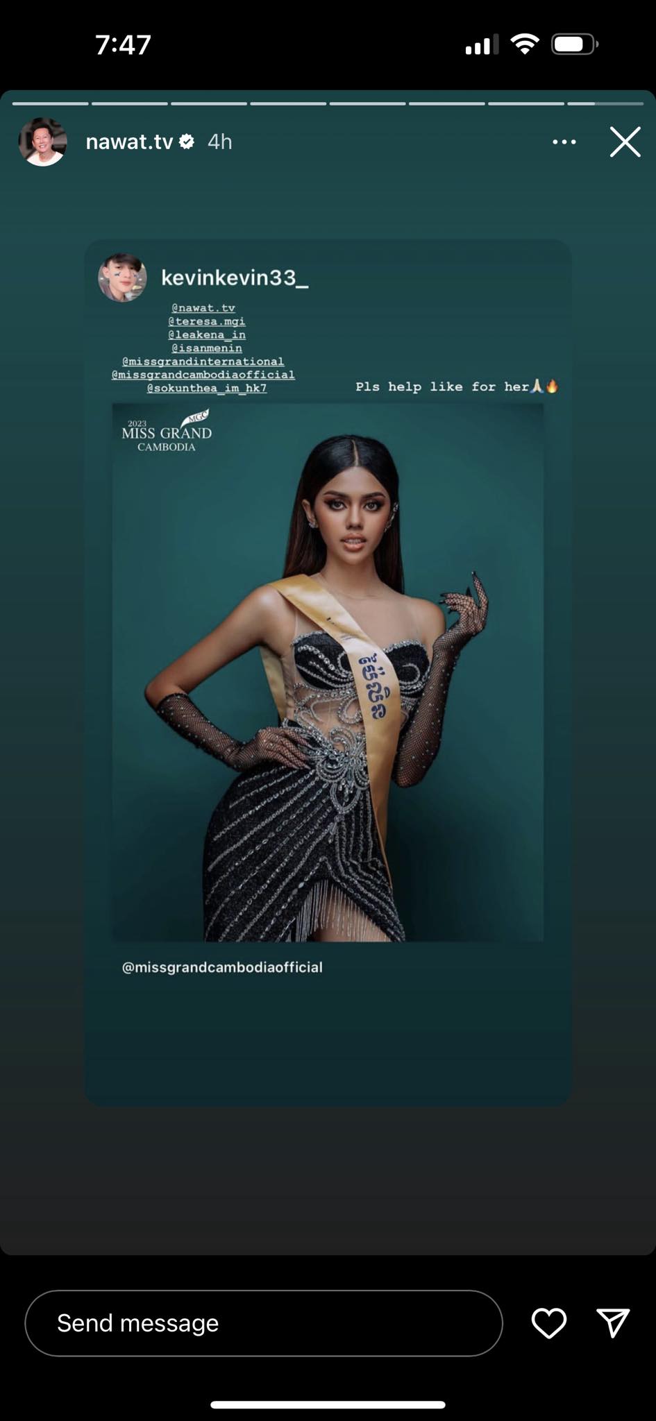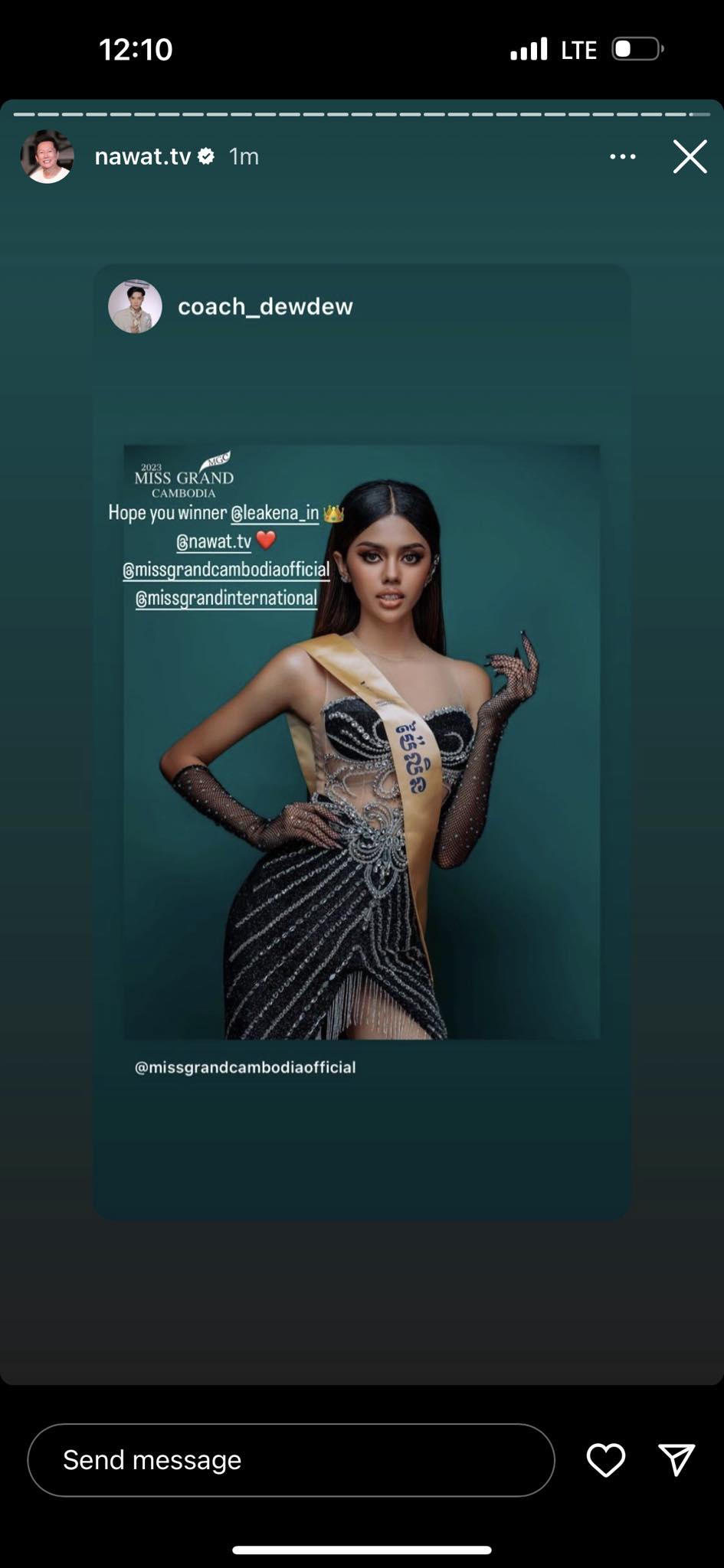 គ្រាន់តែឮបែបនេះភ្លាម ហ្វេនគាំទ្រនាងនាំគ្នាស្រែកហ៊ោកញ្ជ្រៀវកងរំពងបរិវេណកម្មវិធីតែម្តង។ បវរកញ្ញាសម្បុរស្រអែមបែបខ្មែរអង្គររូបនេះ មិនត្រឹមមានហ្វេនក្នុងស្រុកប៉ុណ្ណោះទេ នាងថែមទាំងមានហ្វេននៅក្រៅប្រទេសតាមគាំទ្រទៀតផង សូម្បី Mr. Nawat អ្នកគ្រប់គ្រង Miss Grand International ប្រចាំប្រទេសថៃ ក៏ពេញចិត្តសមត្ថភាពរបស់ អ៊ិន លក្ខិណា រហូត Add រូបនាងចូលក្នុង story របស់លោកថែមទៀតផង។ តាមការកត់សម្គាល់ លក្ខិណា ជាបេក្ខភាព Miss Grand Cambodia 2023 ដំបូងគេដែលត្រូវបាន Mr. Nawat ដាក់ចូល story របស់គាត់។