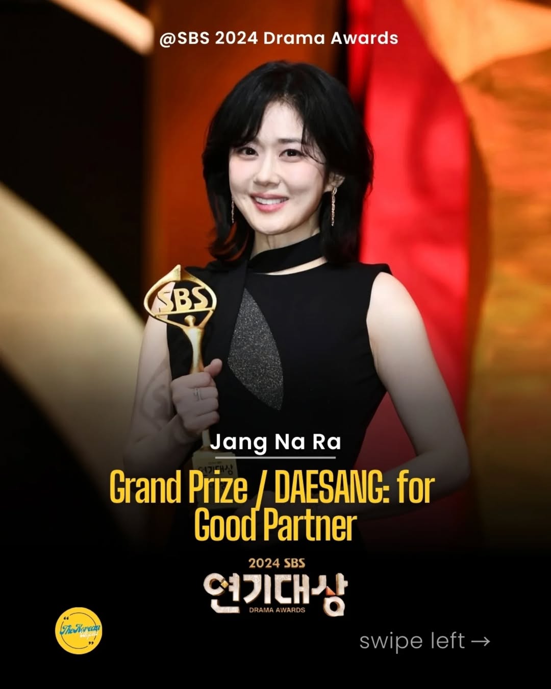 កាលពីថ្ងៃទី២១ ខែធ្នូ តារាសម្ដែងស្រីរូបនេះបានទទួលពានរង្វាន់ Daesang ក្នុងកម្មវិធី 2024 SBS Drama Awards ជាតារាសម្ដែងឆ្នើមបំផុតសម្រាប់ខ្សែភាពយន្ដ “Good Partner”។ ទោះជាយ៉ាងណា នេះមិនមែនជា Daesang ដំបូងរបស់តារាស្រី Jang Na Ra ឡើយដោយក្នុងឆ្នាំ ២០០២ នាងឈ្នះពានរង្វាន់ធំនៅក្នុងកម្មវិធីពានរង្វាន់តន្រ្ដីចុងឆ្នាំចំនួនពីរដែលរៀបចំដោយ KBS និង MBC។ ការទទួលបានសមិទ្ធផលតន្ដ្រីំបែបនេះដោយសារតែបទចម្រៀងល្បីរបស់នាងមានចំណងជើងថា “Sweet Dreams” ដែលអាចគ្រប់គ្រងតារាងតន្ដ្រី និងឈ្នះពានរង្វាន់ក្នុងកម្មវិធីតន្រ្ដីនានានៅពេលចេញផ្សាយផងដែរ។ ហេតុនេះហើយទើបឆ្នាំ ២០០២ គឺជាឆ្នាំជោគជ័យសម្រាប់តារាស្រី Jang Na Ra។