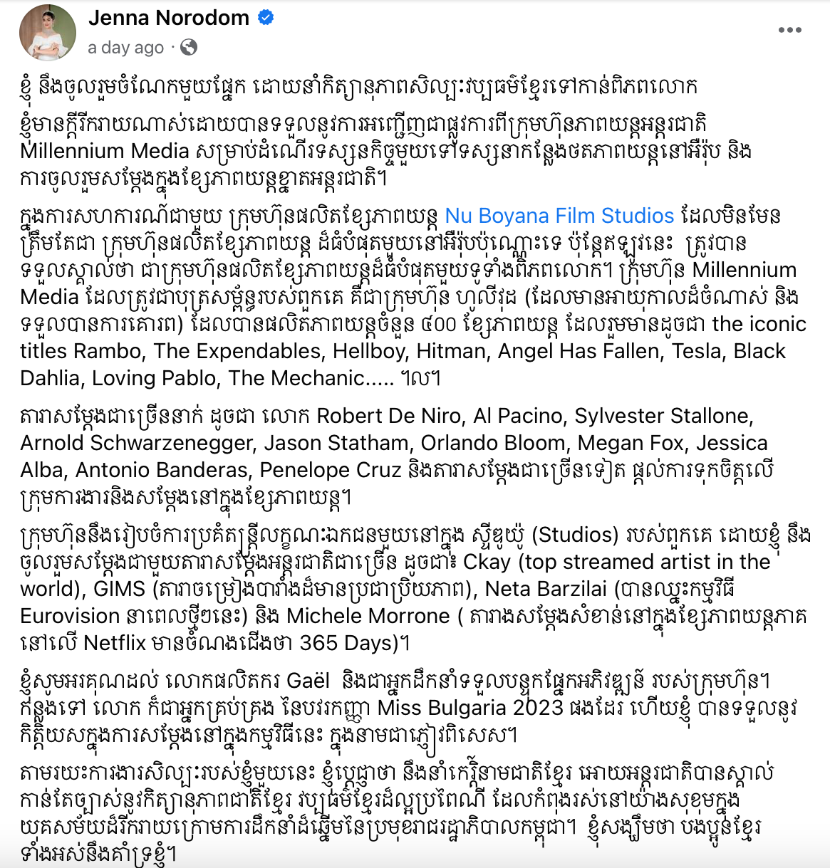 ទំព័រហ្វេសប៊ុកផ្លូវការរបស់ព្រះនាងតូច ជេនណា កាលពីម្សិលមិញ បានបង្ហោះឱ្យដឹងដំណឹងដ៏រីករាយក្រៃលែង ដោយបានប្រកាសជាសាធារណៈថា សែរាជវង្សអង្គនេះនឹងនាំកិត្យានុភាពសិល្បៈវប្បធម៌ខ្មែរទៅកាន់ពិភពលោក តាមរយៈការអញ្ជើញជាផ្លូវការពីក្រុមហ៊ុនភាពយន្តអន្តរជាតិ Millennium Media សម្រាប់ដំណើរទស្សនកិច្ចមួយទៅទស្សនាកន្លែងថតភាពយន្តនៅអឺរ៉ុប និងការចូលរួមសម្តែងក្នុងខ្សែភាពយន្តខ្នាតអន្តរជាតិផងដែរ។